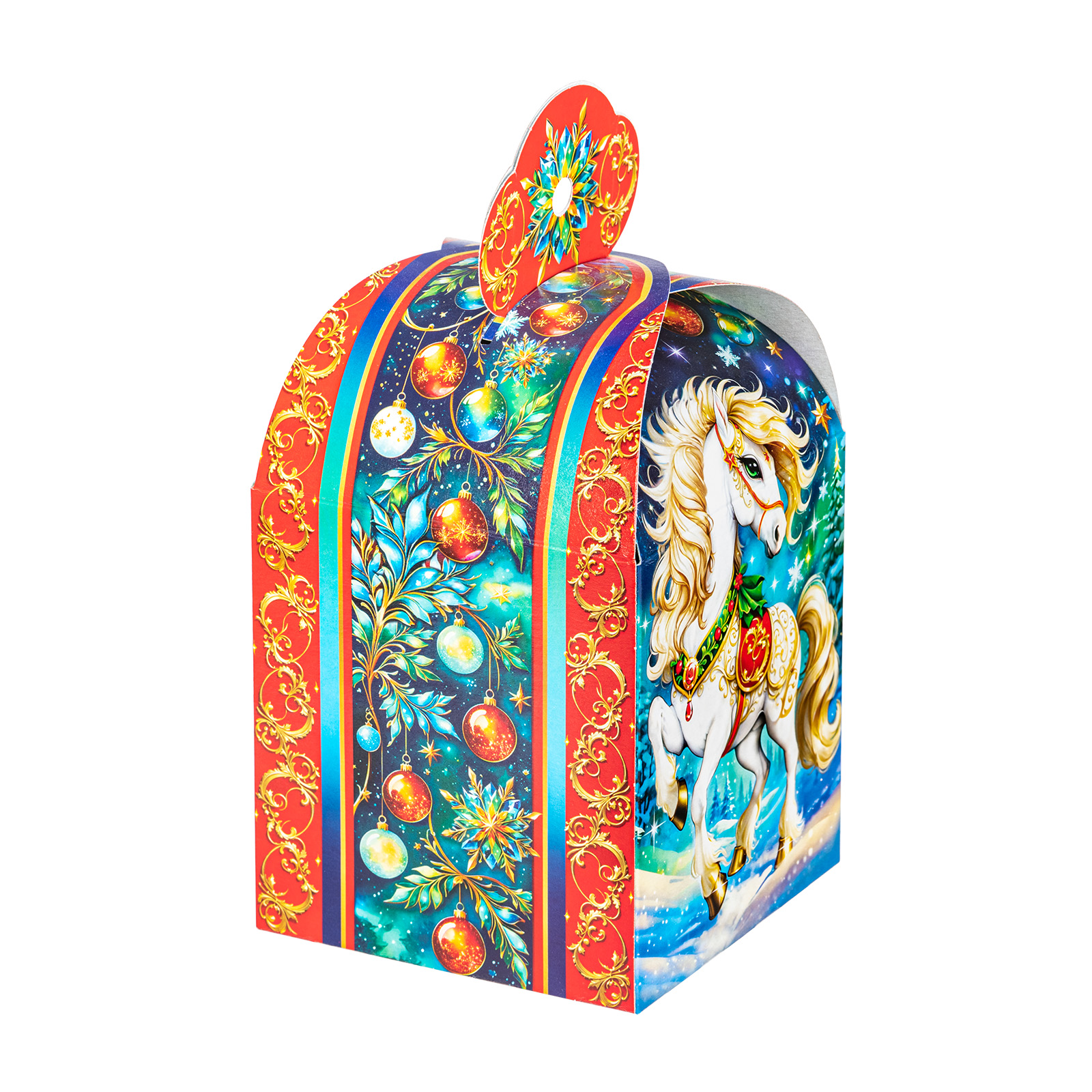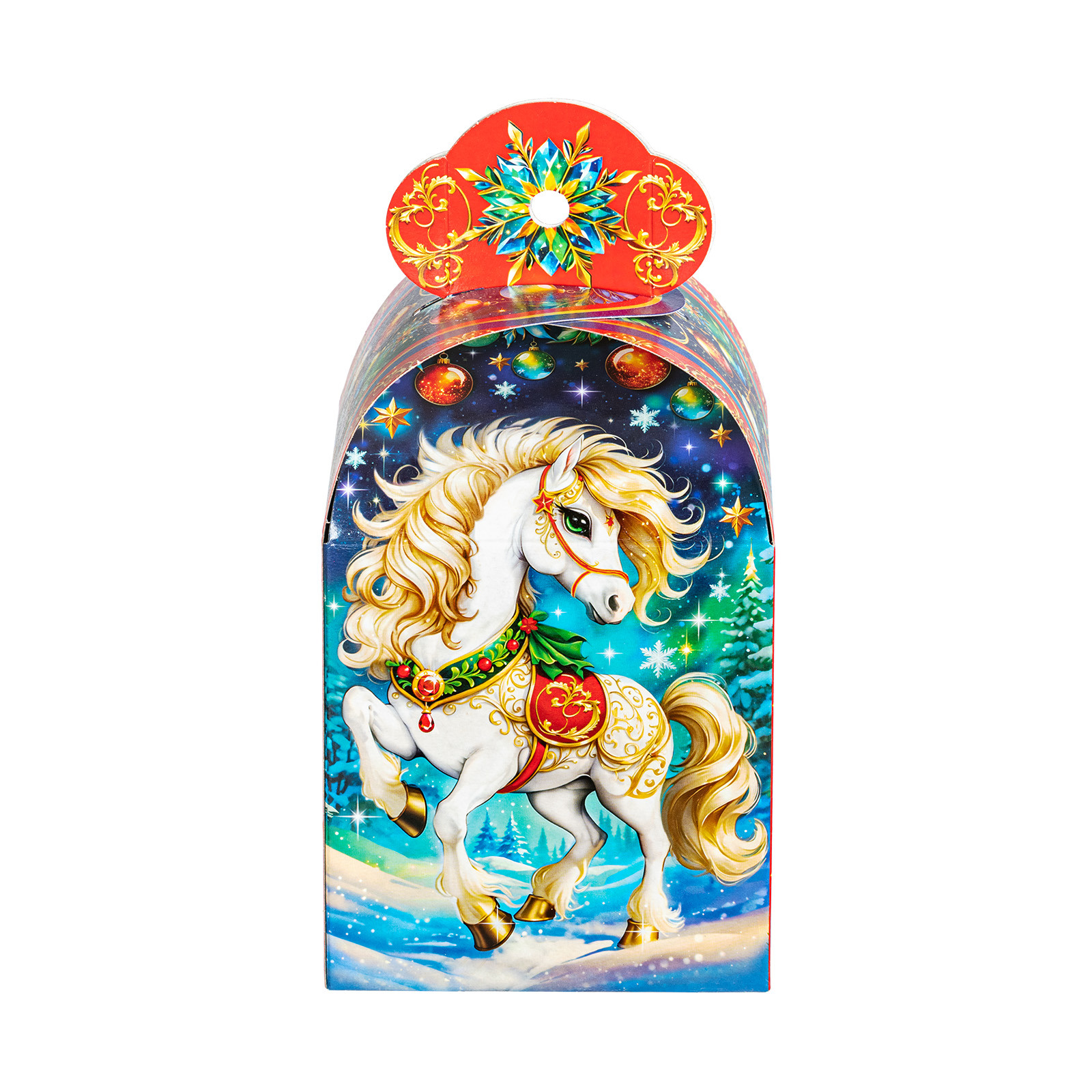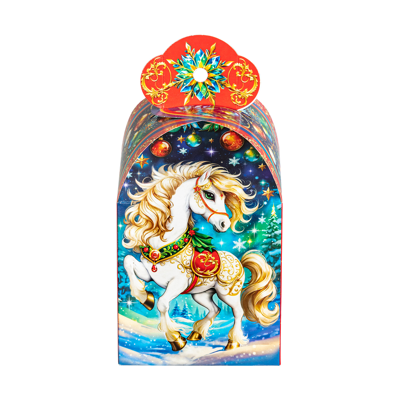 Подарите своим близким волшебное праздничное настроение вместе с новогодним сладким подарком “Буян”. Это небольшая картонная коробочка в форме подковы украшена завораживающим рисунком, на котором изображен грациозный белоснежный конь на фоне зимнего леса. В состав подарка входит 700 грамм отборных сладостей от ведущих кондитерских производителей, а также небольшой памятный сувенир в виде символа наступающего года. Такой презент можно смело вручить сластене любого возраста - положительные эмоции будут гарантированы!