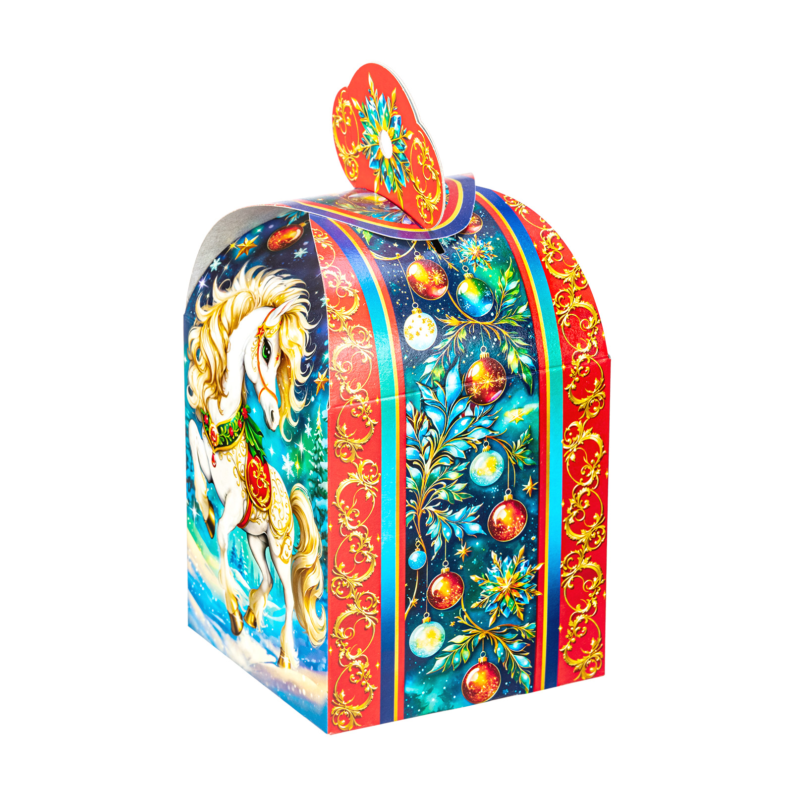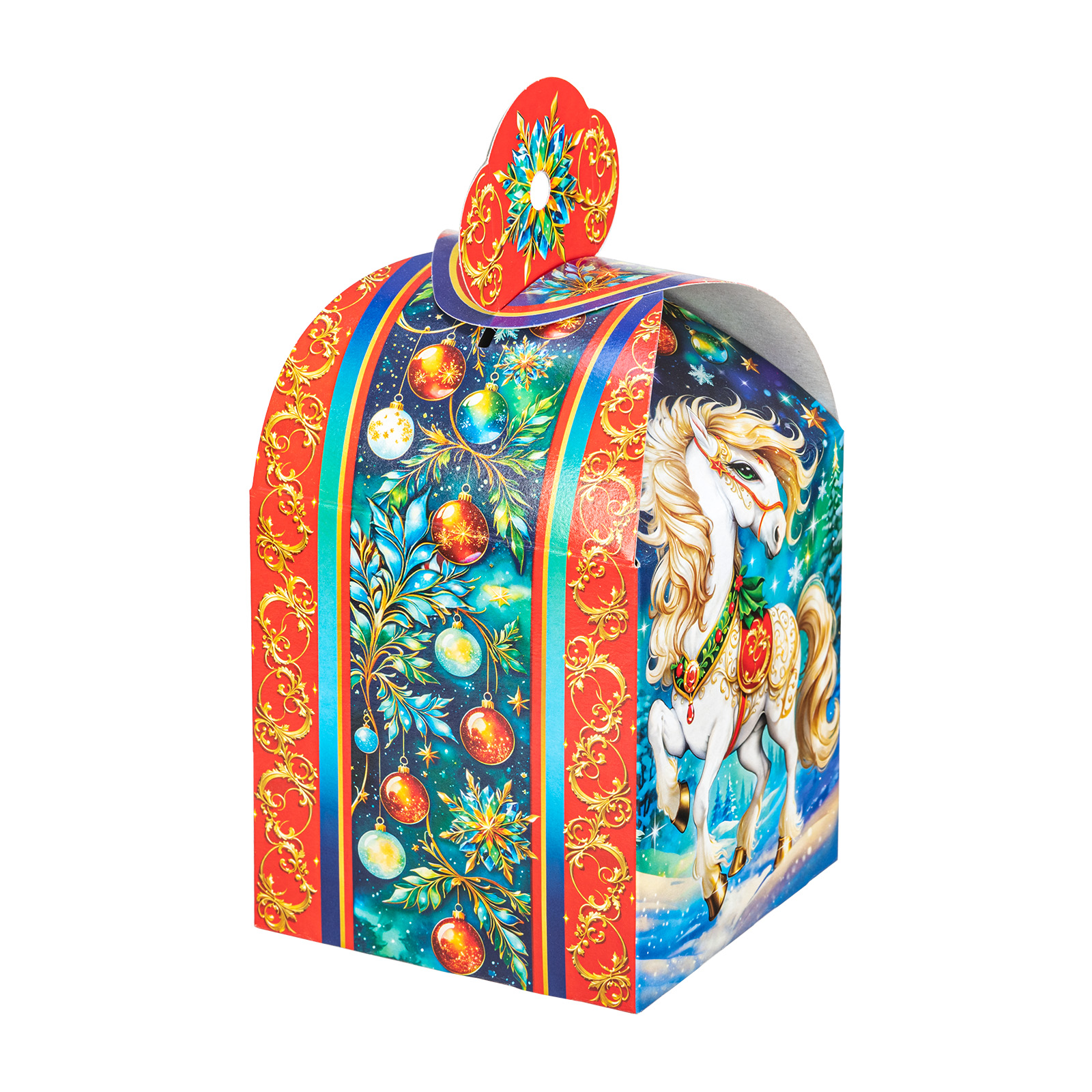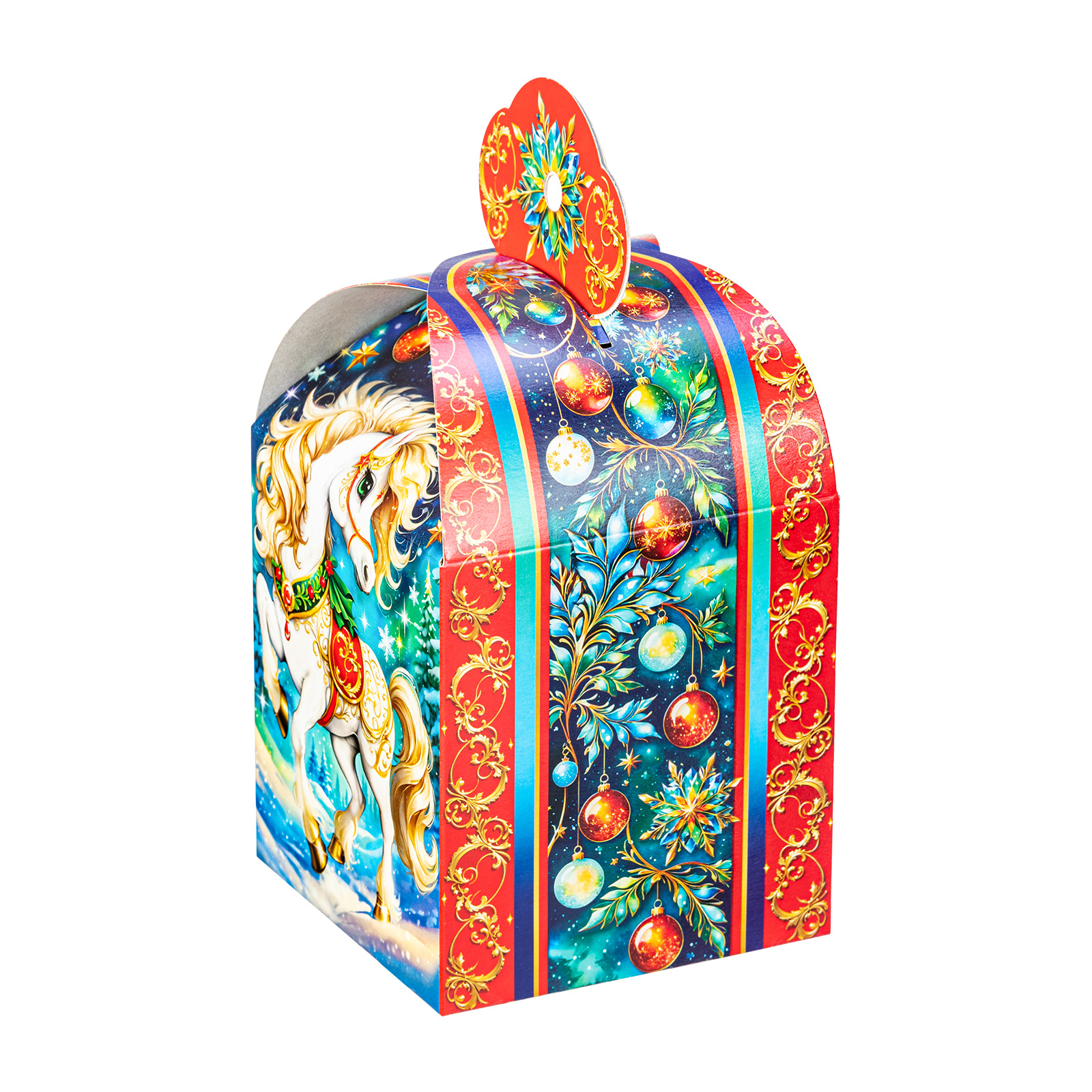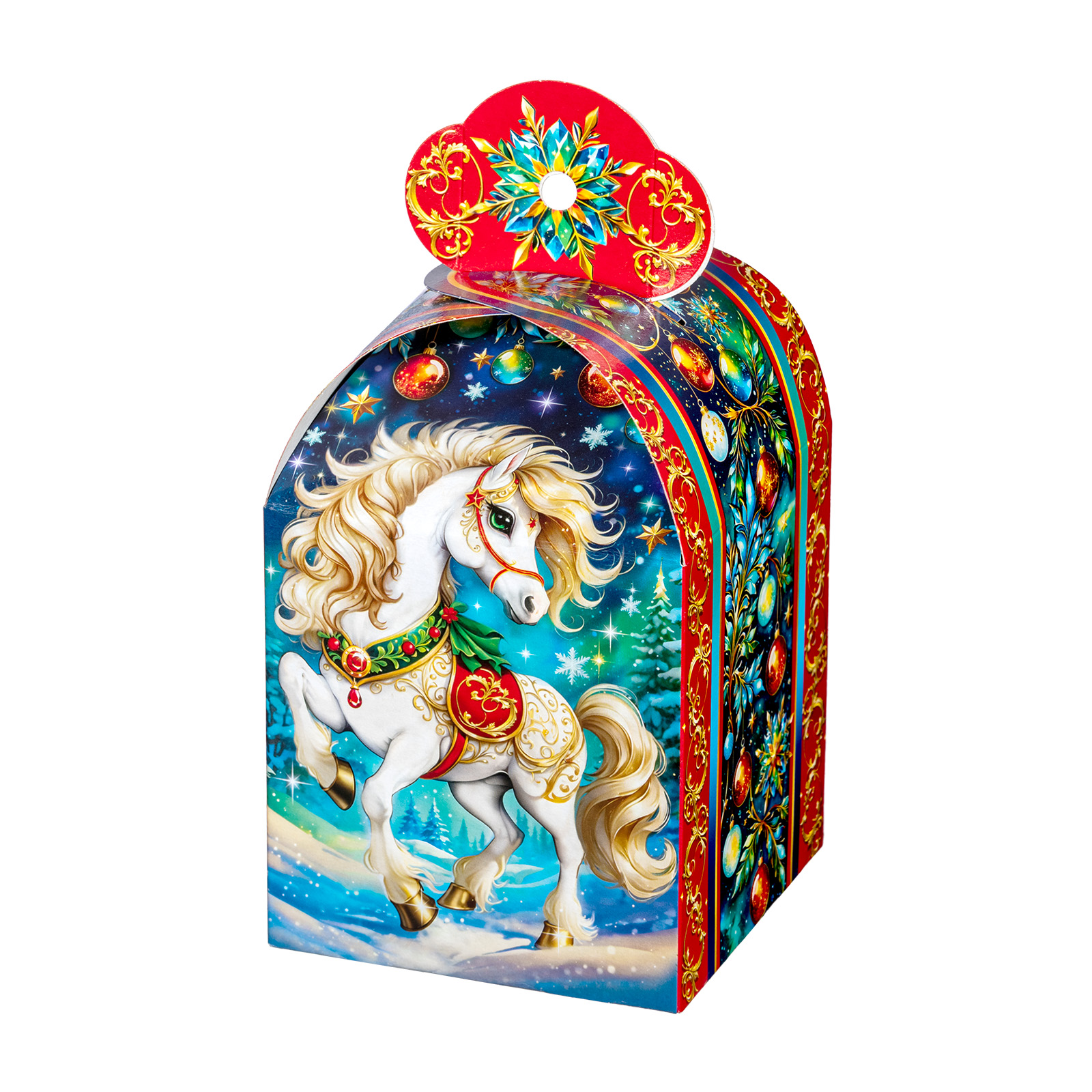 Подарите своим близким волшебное праздничное настроение вместе с новогодним сладким подарком “Буян”. Это небольшая картонная коробочка в форме подковы украшена завораживающим рисунком, на котором изображен грациозный белоснежный конь на фоне зимнего леса. В состав подарка входит 700 грамм отборных сладостей от ведущих кондитерских производителей, а также небольшой памятный сувенир в виде символа наступающего года. Такой презент можно смело вручить сластене любого возраста - положительные эмоции будут гарантированы!