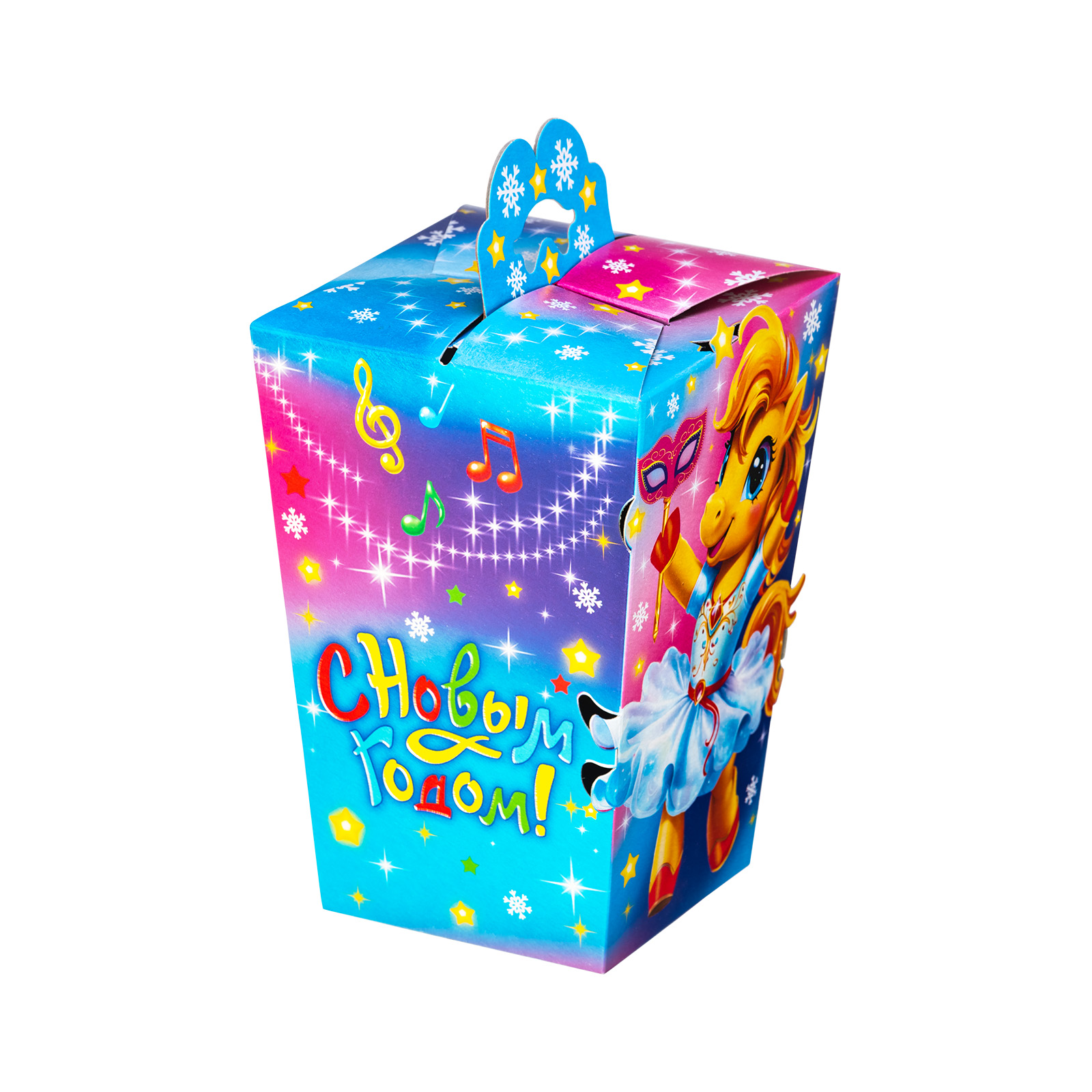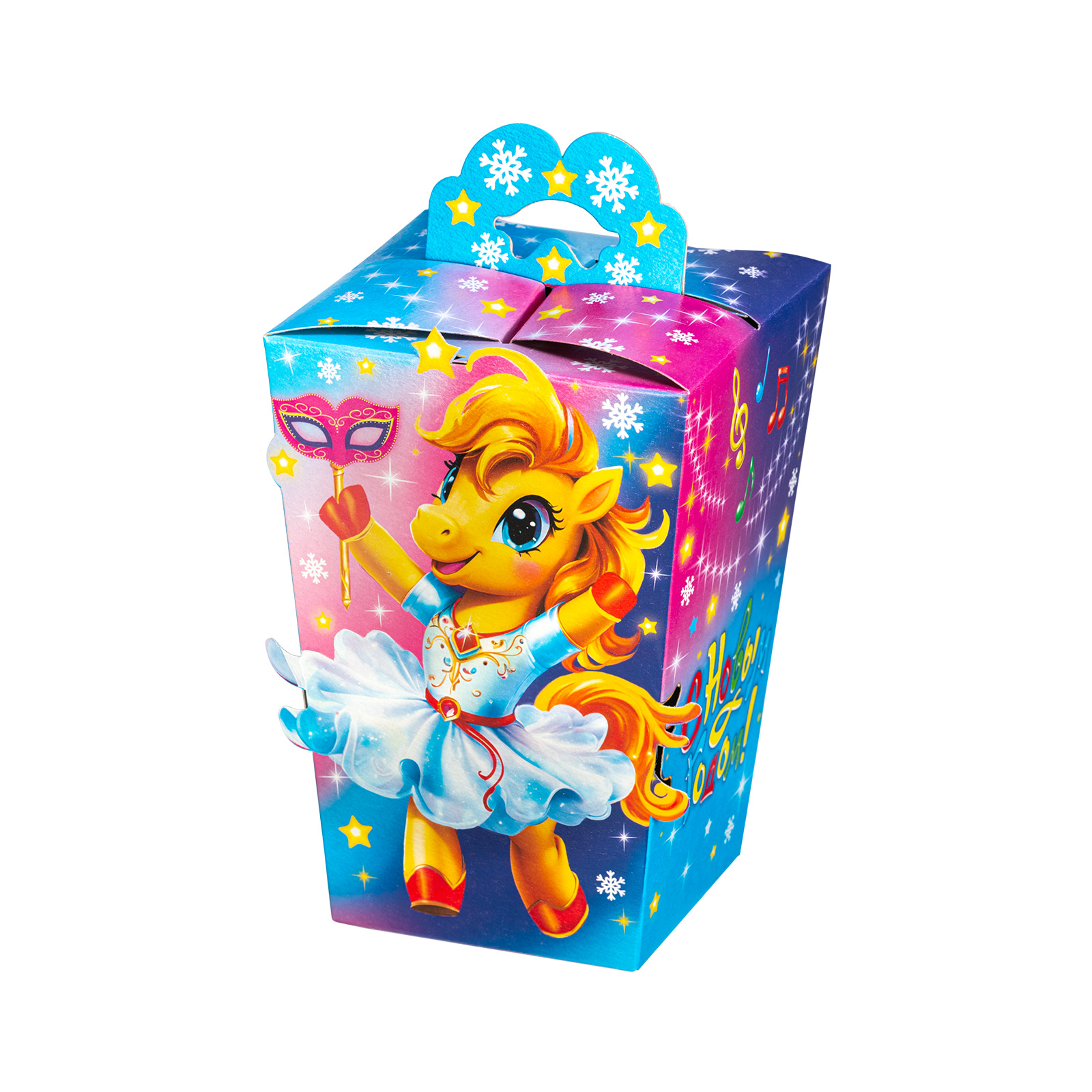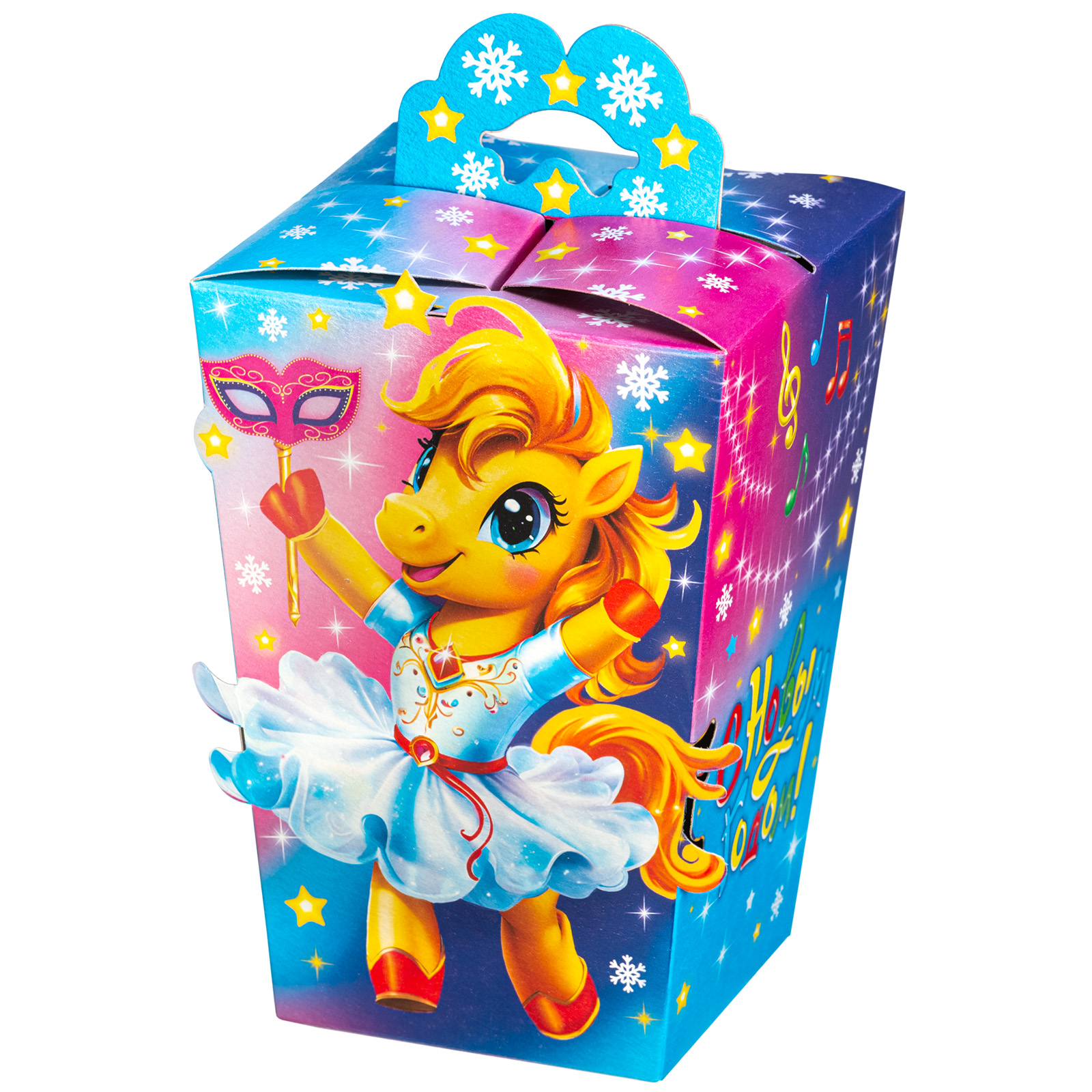 Привлекательный новогодний сладкий подарок, который станет идеальным дополнением к любому новогоднему празднику в школе или детском саду. Подарочная упаковка из качественного плотного картона выполнена в форме небольшого фонарика с удобной ручкой. Упаковка сочетает в себе холодные и теплые оттенки, что создает особое праздничное настроение. На одной из сторон мы видим яркий рисунок - крошку-лошадку в праздничном платьице, которая искренне радуется приближению новогодней ночи.  В набор входит более 30 разнообразных сладостей  и небольшой памятный сувенир.