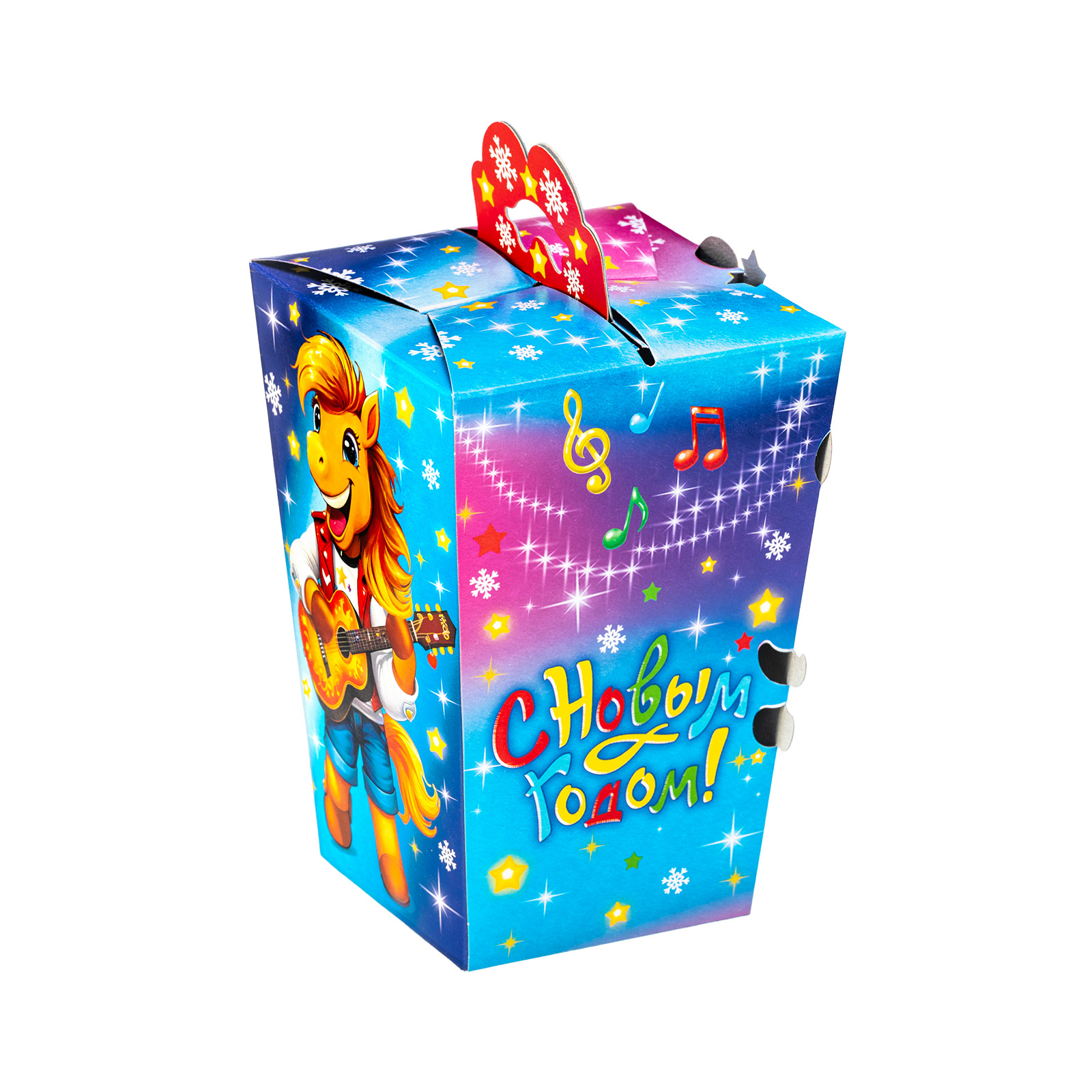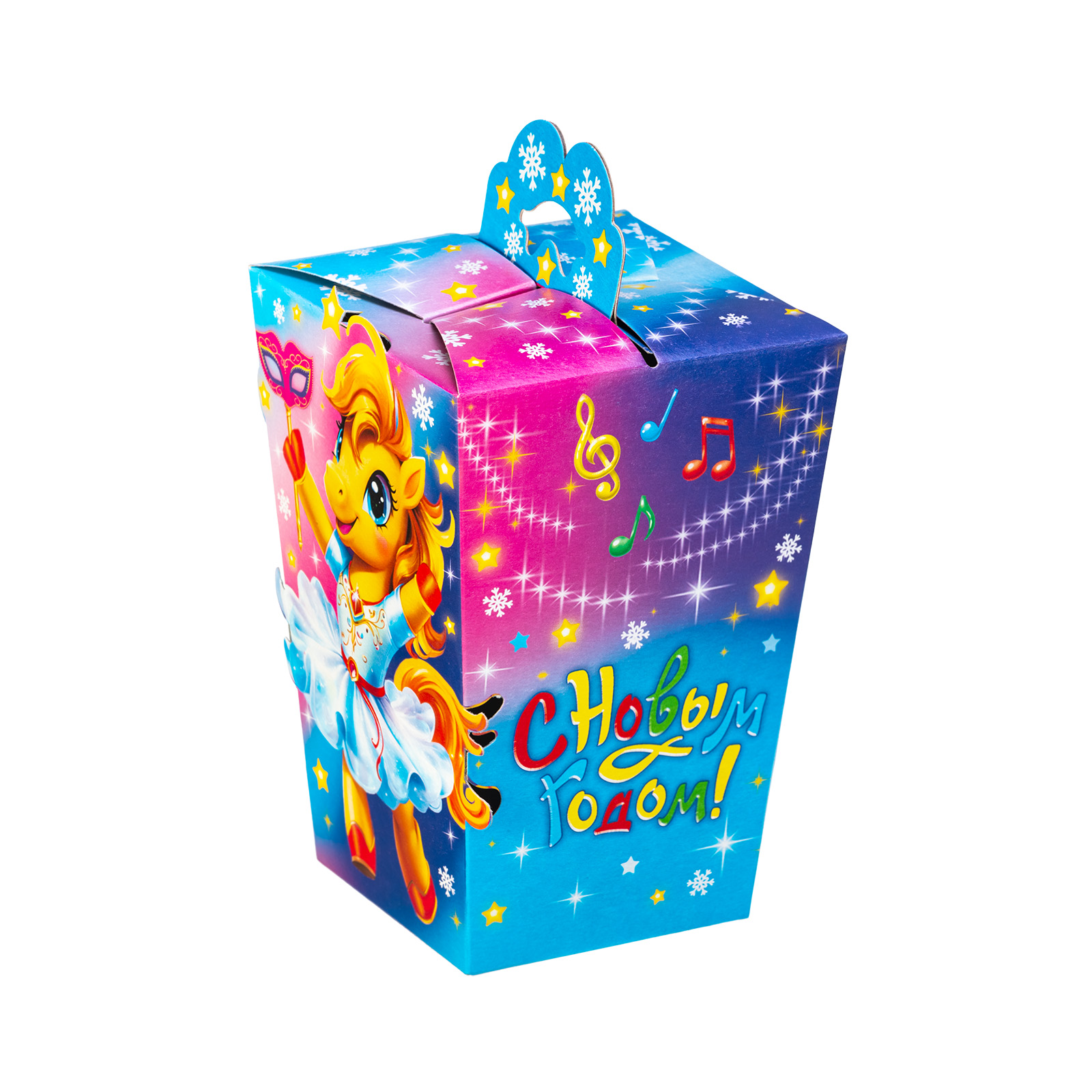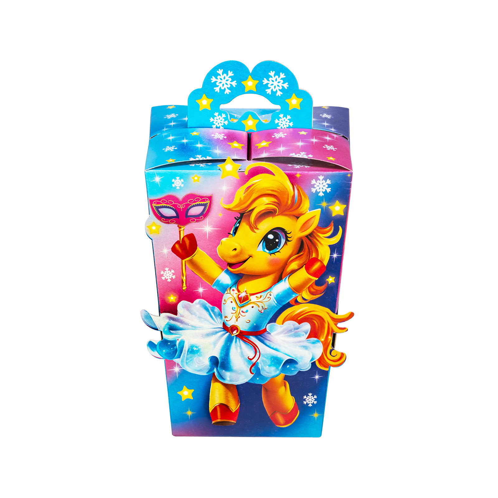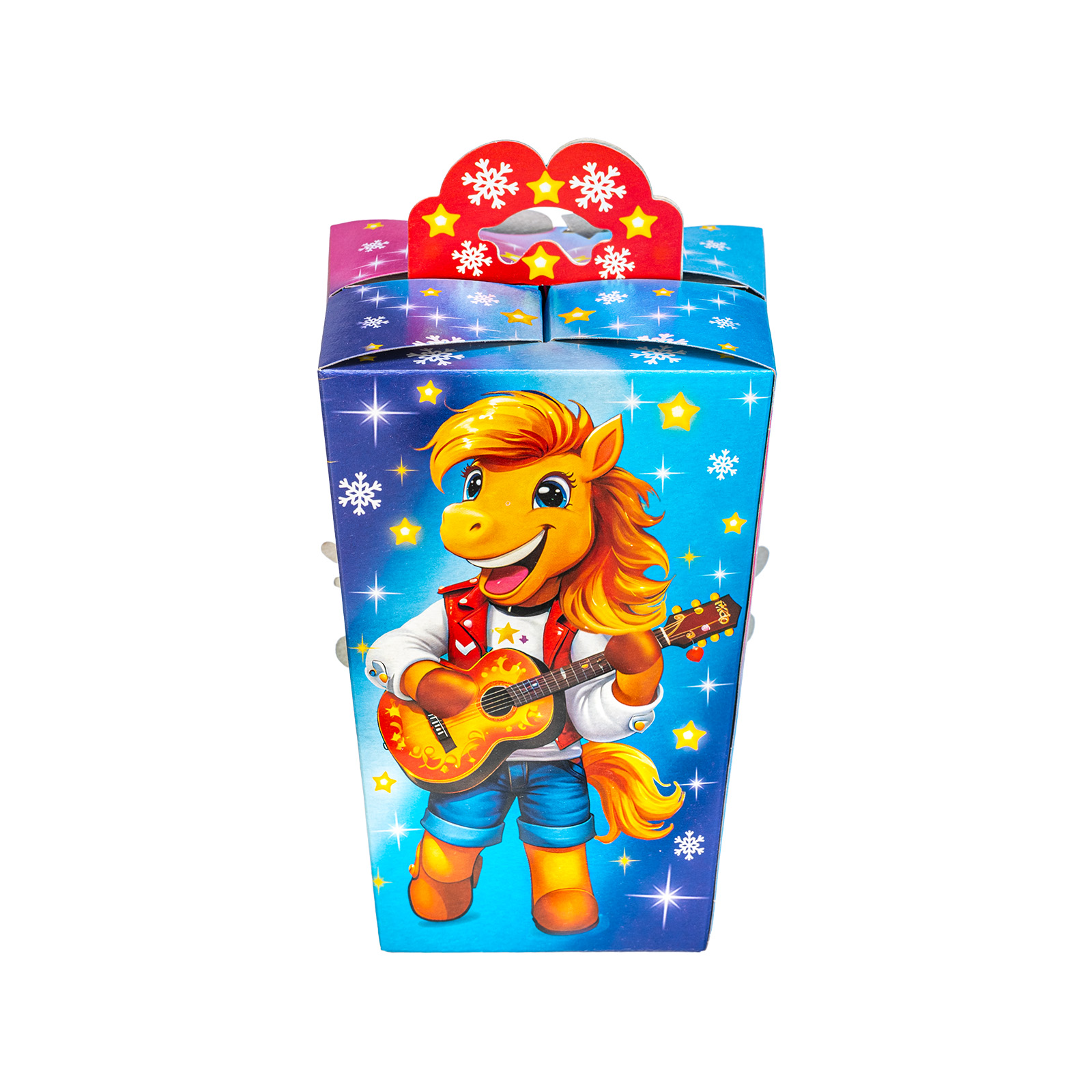 Привлекательный новогодний сладкий подарок, который станет идеальным дополнением к любому новогоднему празднику в школе или детском саду. Подарочная упаковка из качественного плотного картона выполнена в форме небольшого фонарика с удобной ручкой. Упаковка сочетает в себе холодные и теплые оттенки, что создает особое праздничное настроение. На одной из сторон мы видим яркий рисунок - крошку-лошадку в праздничном платьице, которая искренне радуется приближению новогодней ночи.  В набор входит более 30 разнообразных сладостей  и небольшой памятный сувенир.