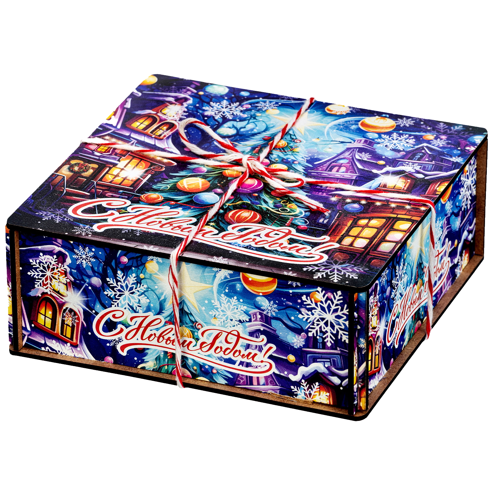 Интересный вариант новогоднего подарка – «Хрустальная Сказка (Легенды Москвы)». Он представлен в разделе Дерево. Отлично подойдет на подарок в 2026 году с символом Лошадь. Внутри такого презента находится кондитерский набор весом 600 граммов.