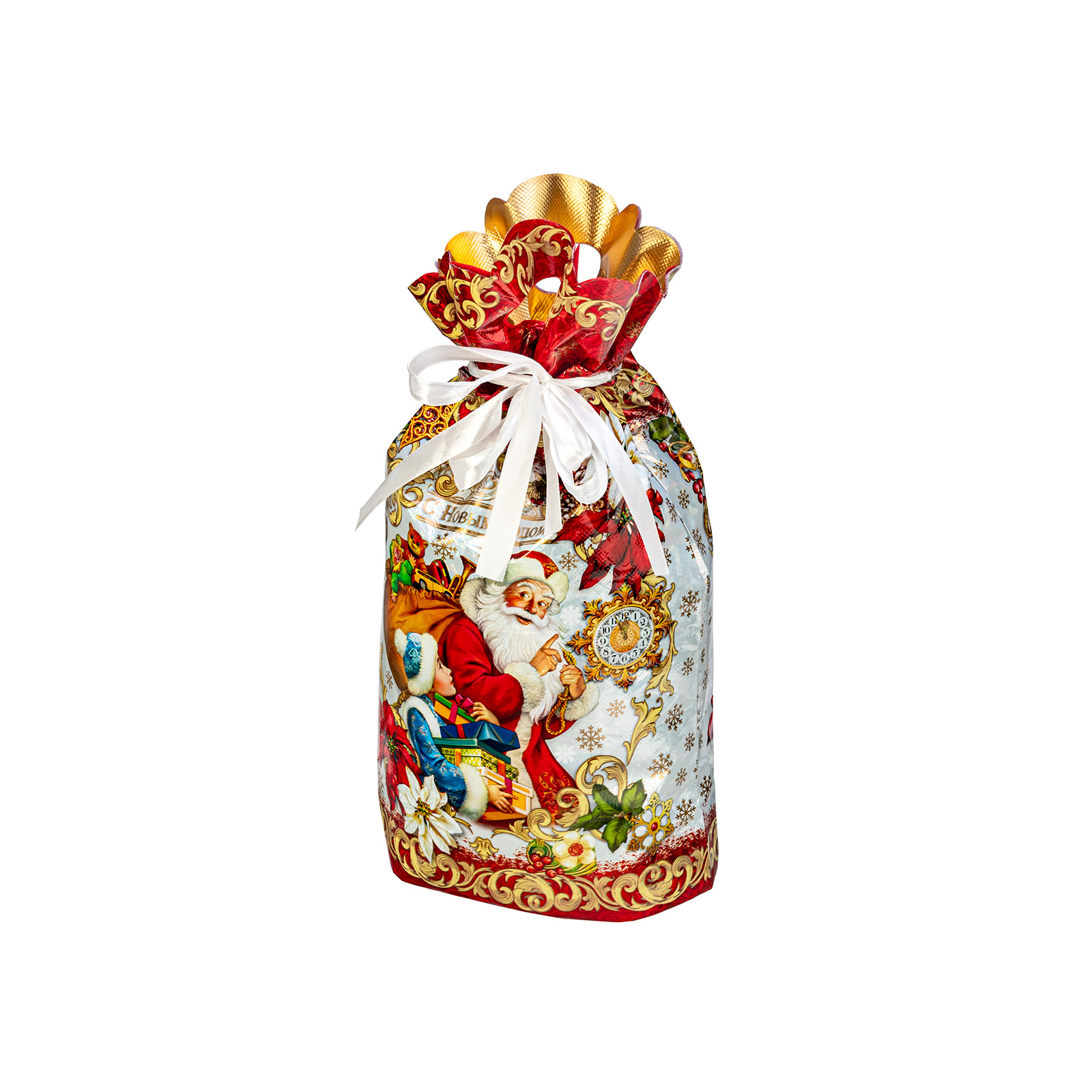 Интересный вариант новогоднего подарка – «Мешок Время чудес». Отлично подойдет на подарок в 2026 году с символом Лошадь. Внутри такого презента находится кондитерский набор весом 900 граммов.