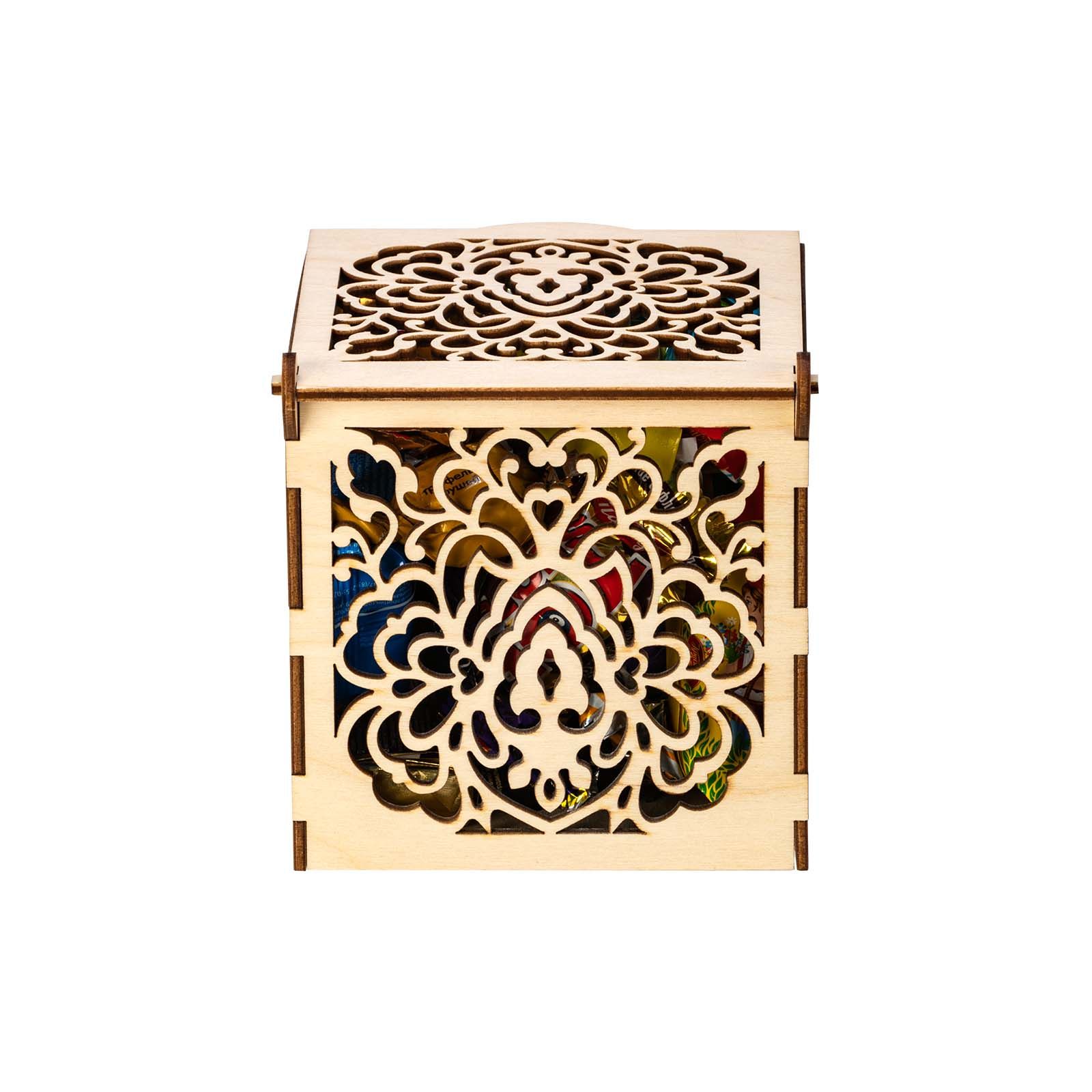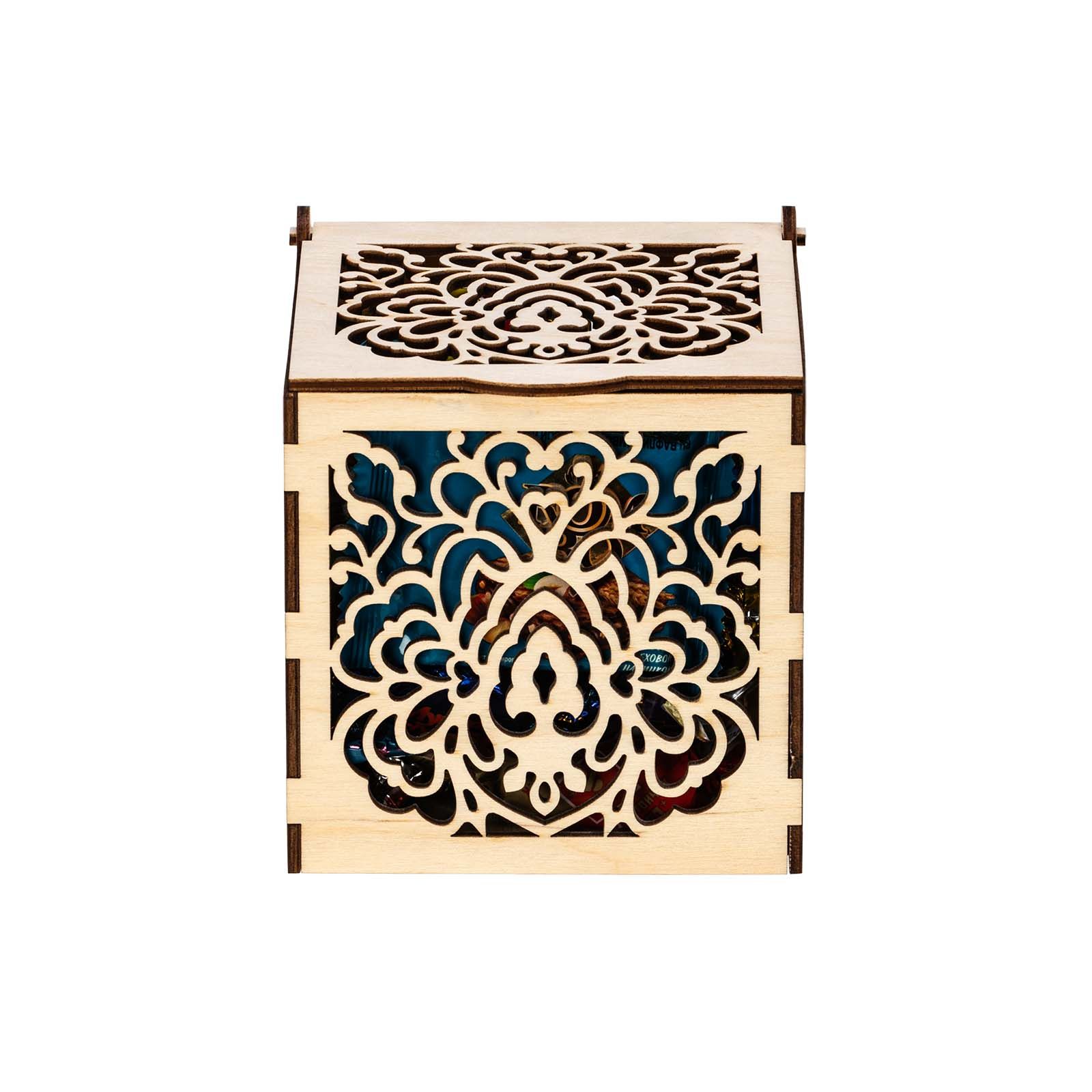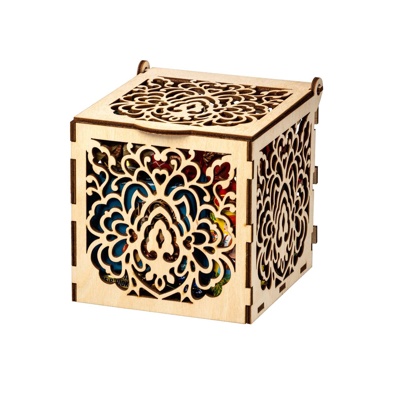 Подробнее о доставкеЕсли вы хотите красиво поздравить с Новым годом коллегу по работе, партнера или любимую подругу, то обращаем ваше внимание на элегантный презент «Морозные кружева». Это деревянная шкатулка с резными узорами на каждой из граней. Короб не покрыт краской, поэтому при желании можно раскрасить его по своему вкусу, проявив тем самым свои творческие способности. Упаковка практична тем, что ее можно использовать как предмет интерьера, конфетницу, для хранения мелочей. Сладости весом 400 граммов расположены внутри. Только самые свежие и вкусные кондитерские изделия: шоколадные конфеты, печенье, десерты, вафли и многое другое. Обязательно найдите минутку насладиться сладким мгновением за чашечкой ароматного кофе и крепкого чая.