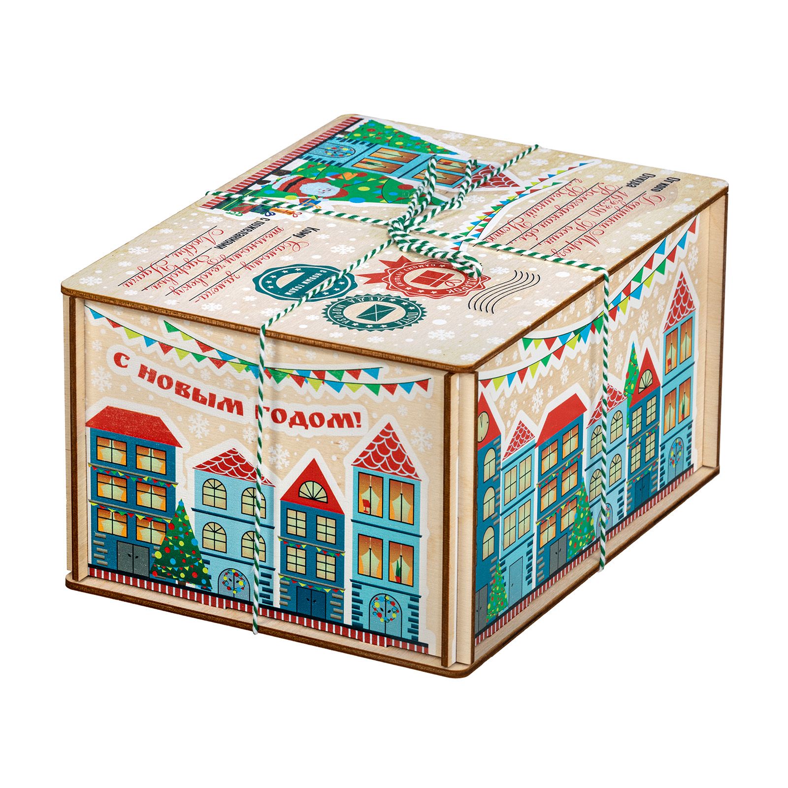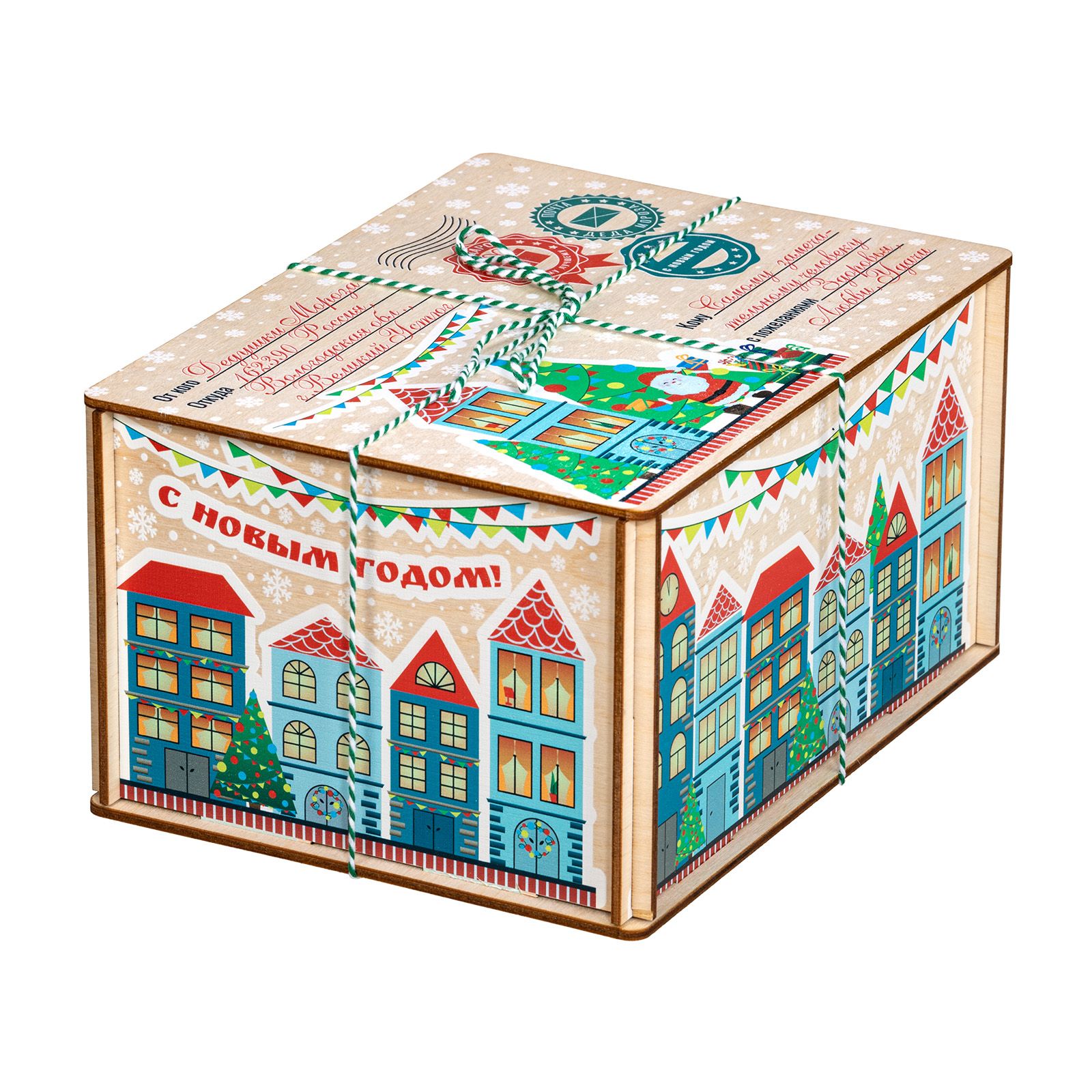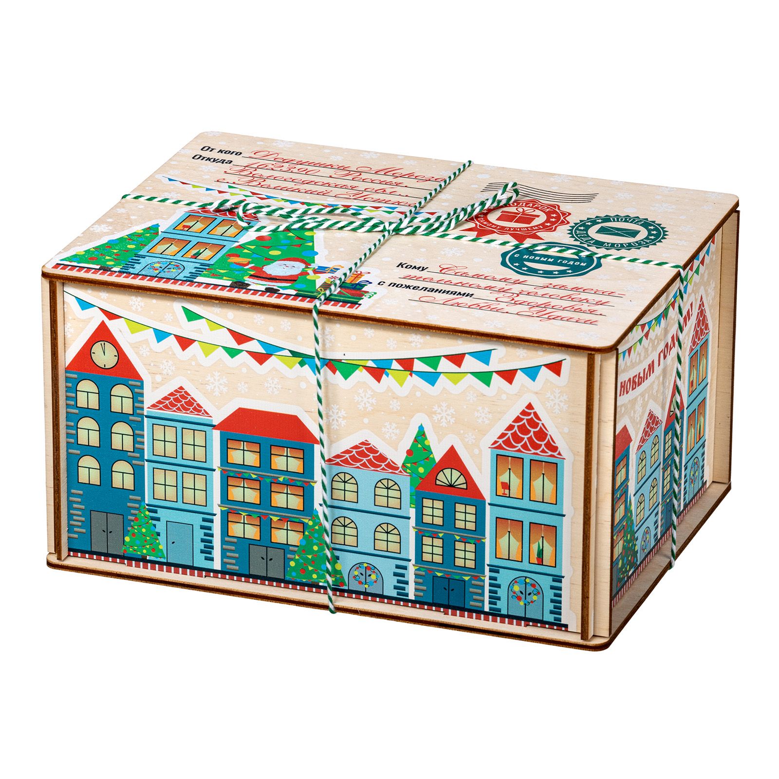 Прекрасный подарок с почтовой символикой – «Новогодний городок». Это деревянная коробочка размером 21*11*14. В которой находится кондитерский набор весом 1000 граммов. Только самые свежие и вкусные кондитерские изделия: шоколадные конфеты, печенье, десерты, вафли и многое другое. На подарке изображен новогодний городок, который украшен нарядными ёлками, разноцветными флажками и гирляндами. Подарок перевязан веревочкой, которая обеспечивает сохранность подарка. В дальнейшем эту удивительную коробочку можно использовать для хранения разных мелочей.