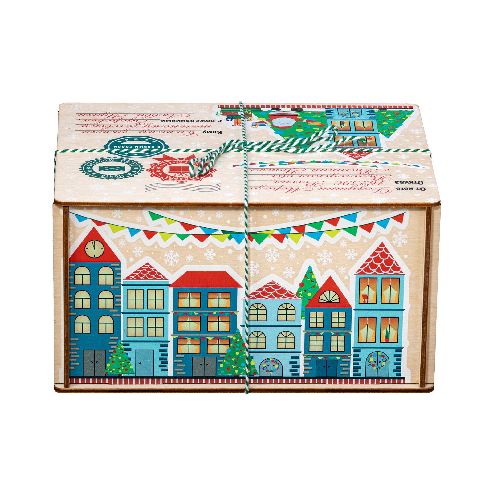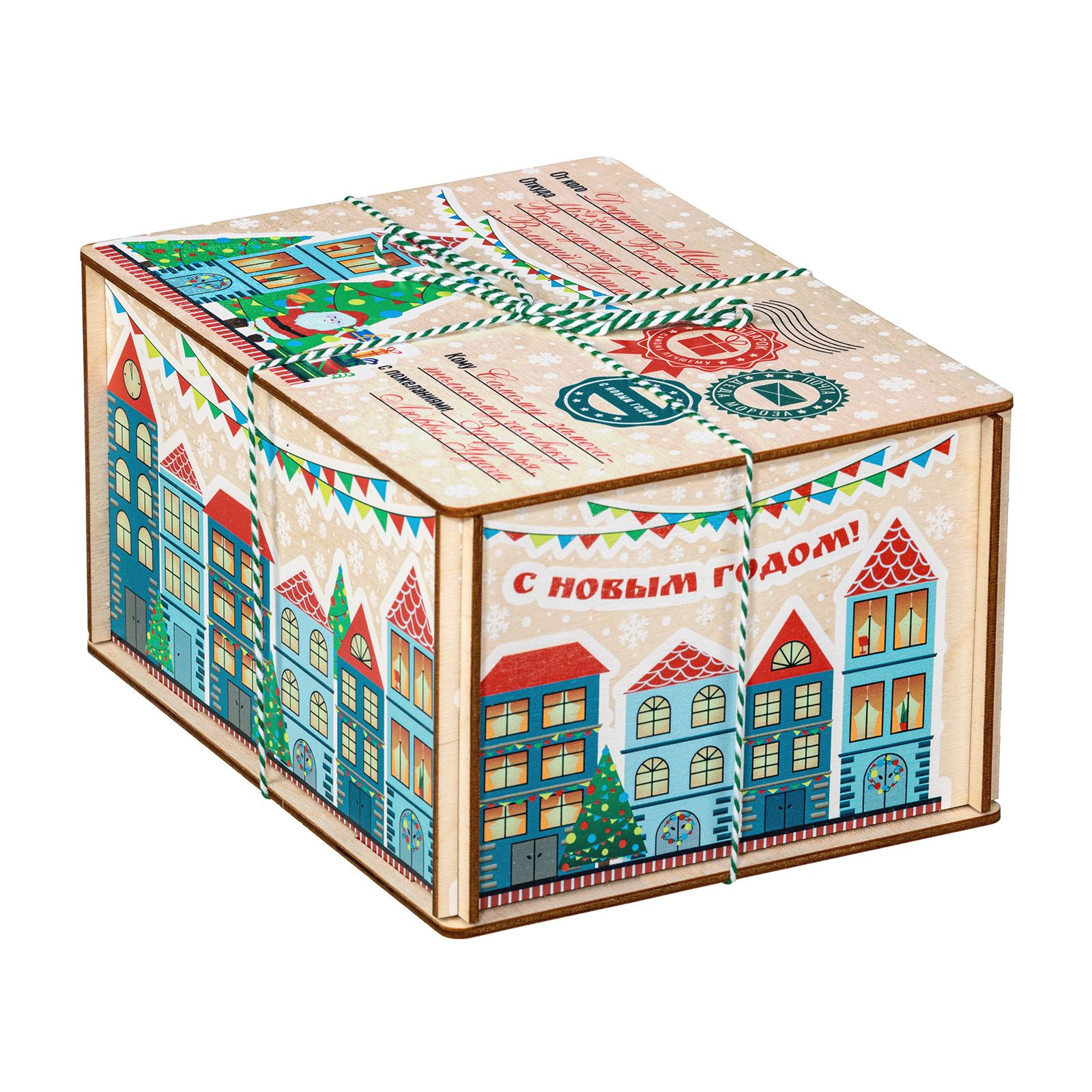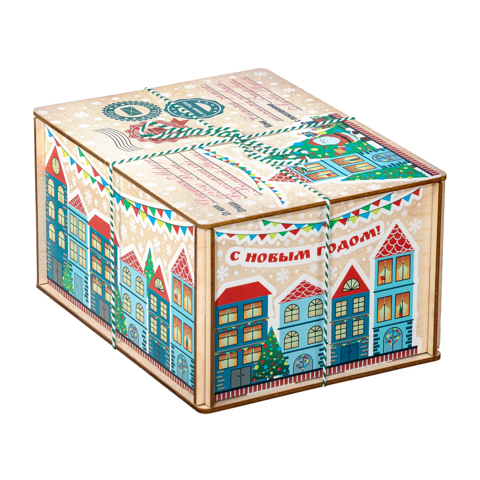 Прекрасный подарок с почтовой символикой – «Новогодний городок». Это деревянная коробочка размером 21*11*14. В которой находится кондитерский набор весом 1000 граммов. Только самые свежие и вкусные кондитерские изделия: шоколадные конфеты, печенье, десерты, вафли и многое другое. На подарке изображен новогодний городок, который украшен нарядными ёлками, разноцветными флажками и гирляндами. Подарок перевязан веревочкой, которая обеспечивает сохранность подарка. В дальнейшем эту удивительную коробочку можно использовать для хранения разных мелочей.