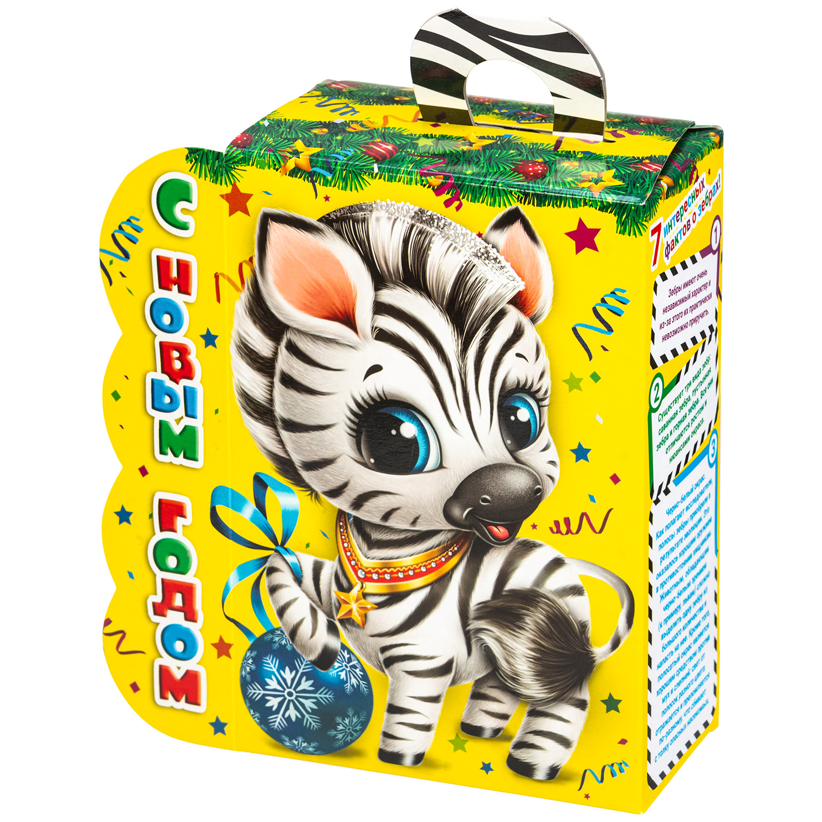 Ищете новогодний сладкий подарок в школу или детский сад? Присмотритесь к набору “Полосатый талисман”! Несмотря на небольшие размеры, этот подарок способен подарить безграничную радость тому, кто его получит. Сладости упакованы в маленькую ярко-желтую коробочку с изображением очаровательной крошки-зебры, которая приветливо улыбается и будто приглашает нас к новогоднему столу. Сверху находится небольшая черно-белая ручка,а сбоку коробочки можно найти статью с интересными фактами о зебрах. В состав подарка входит 700 грамм самых разнообразных отборных сладостей, которые скрасят любое семейное чаепитие и помогут наполнить дом позитивом и добром!