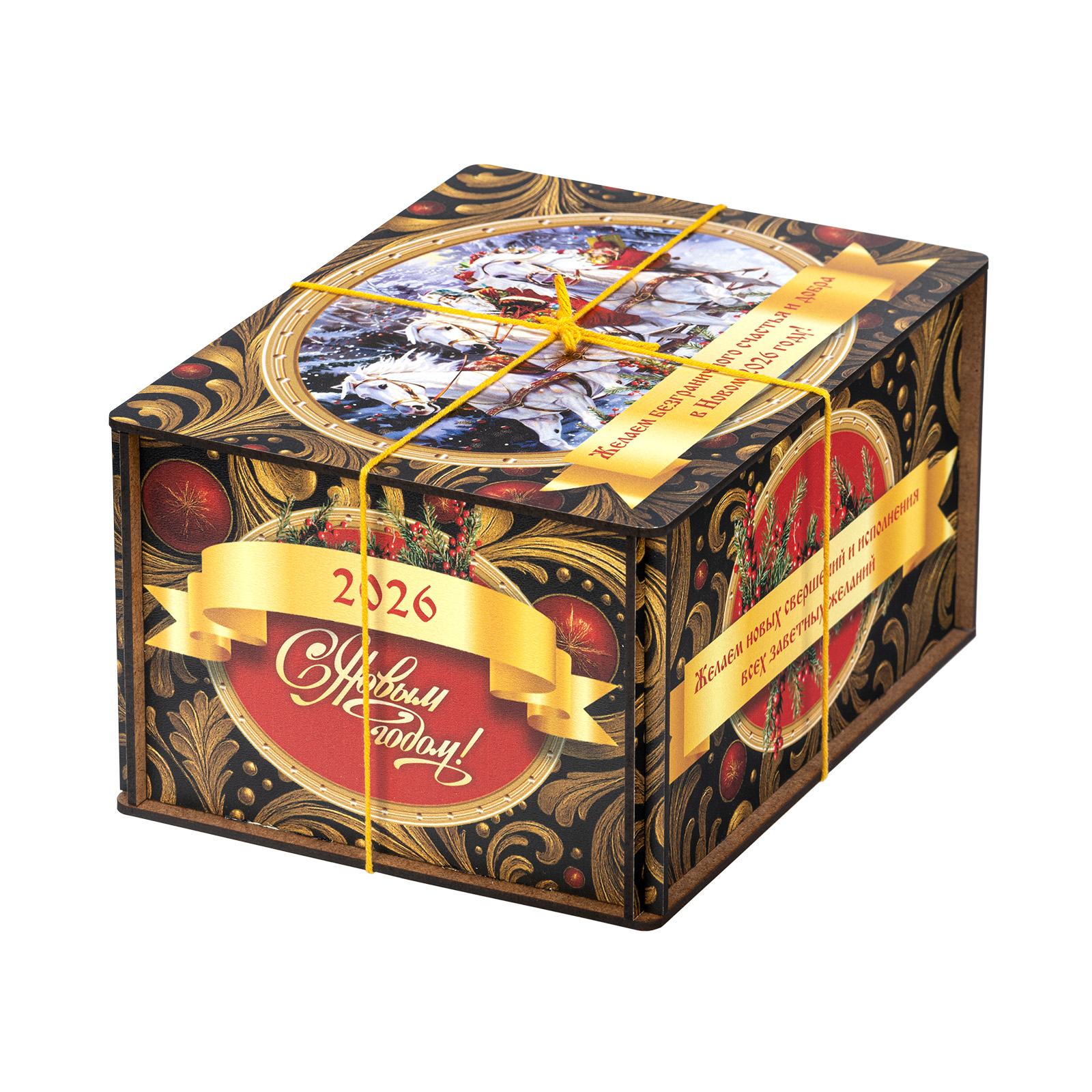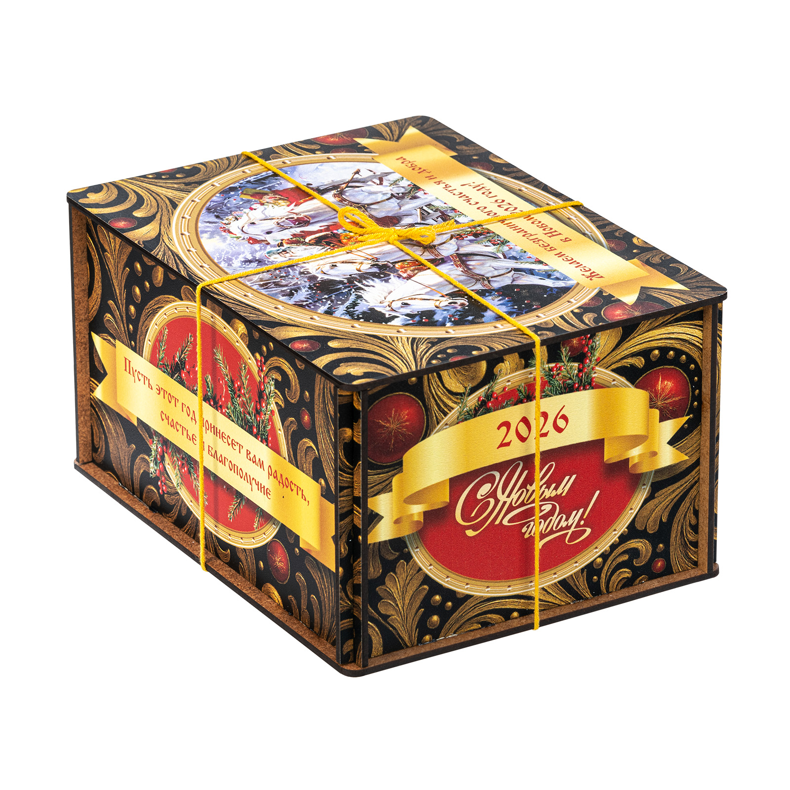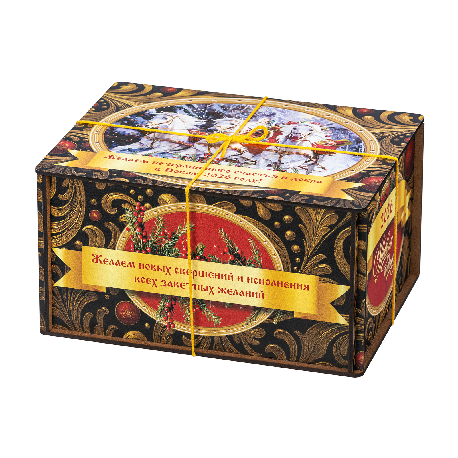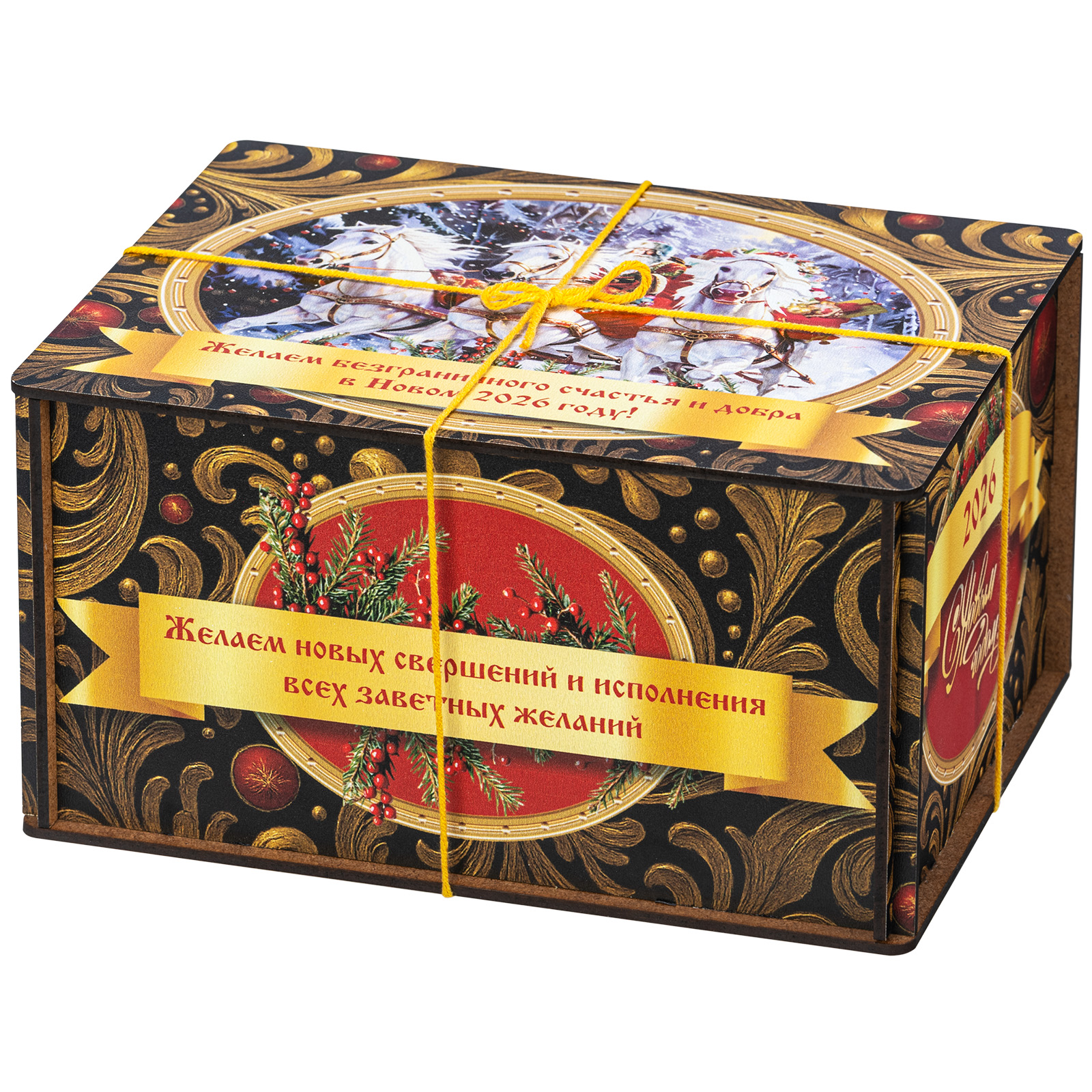 Интересный вариант новогоднего подарка – «Посылка Черный Бархат (Легенды Москвы)». Он представлен в разделе Дерево. Отлично подойдет на подарок в 2026 году с символом Лошадь. Внутри такого презента находится кондитерский набор весом 1500 граммов.