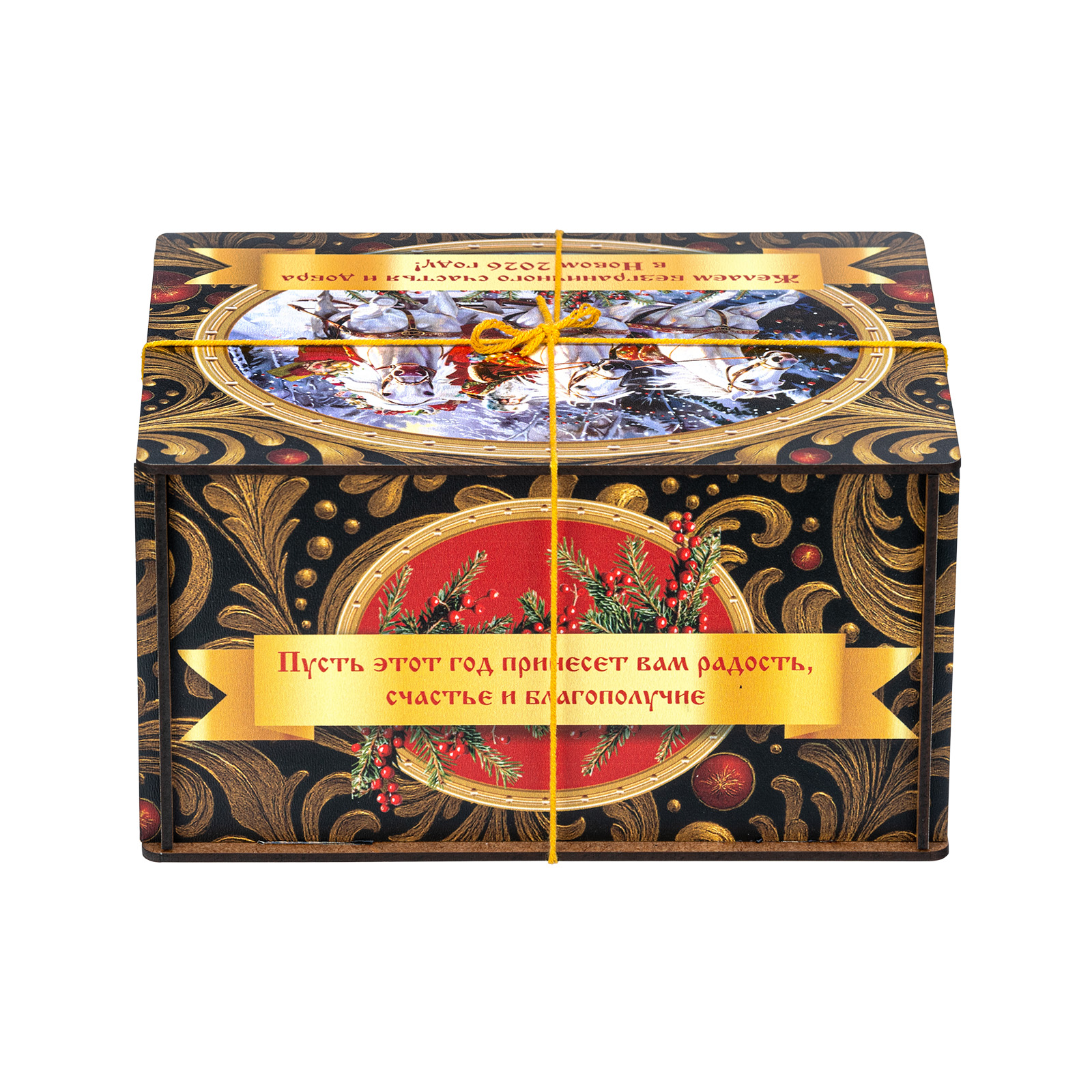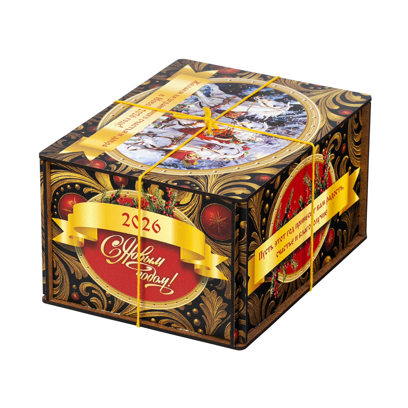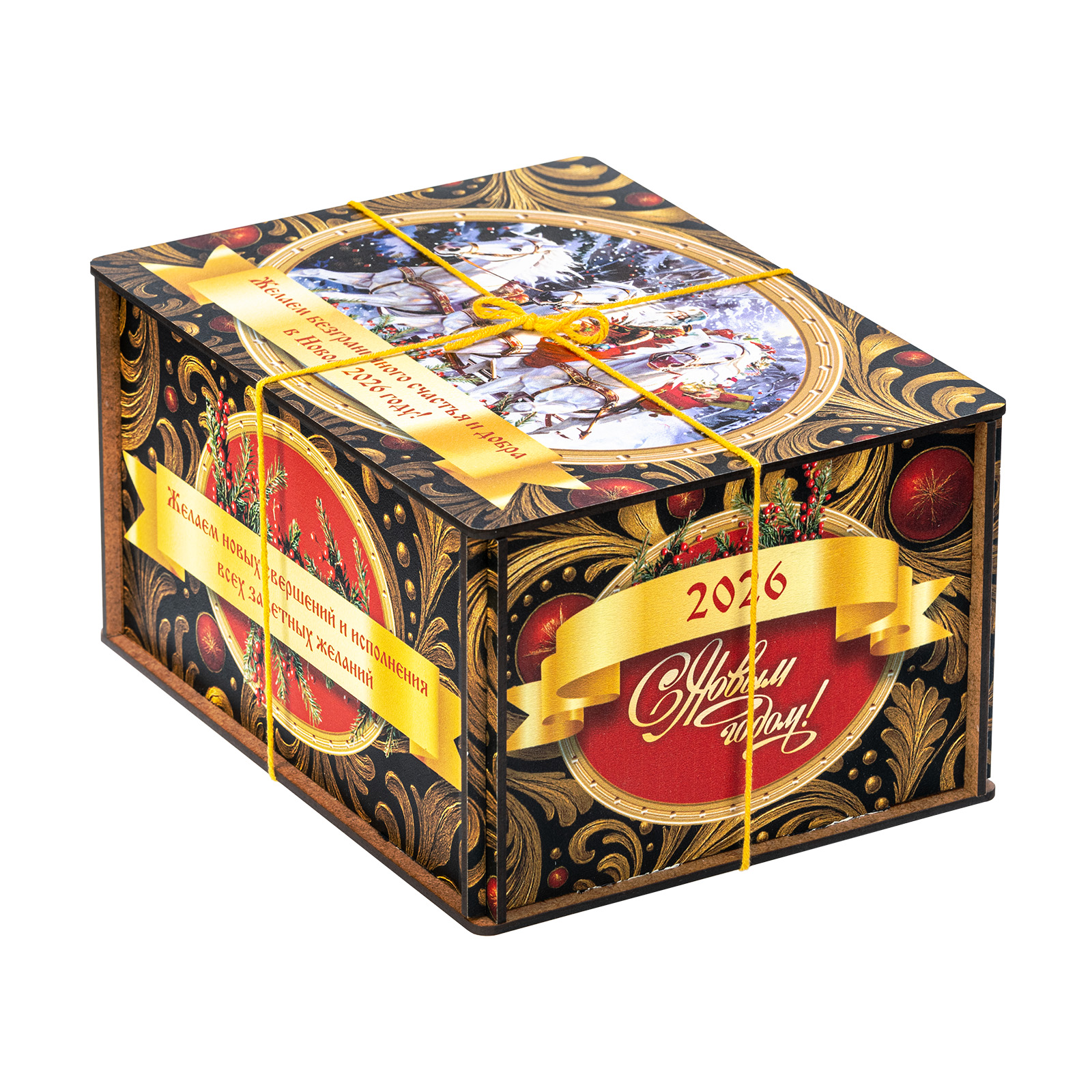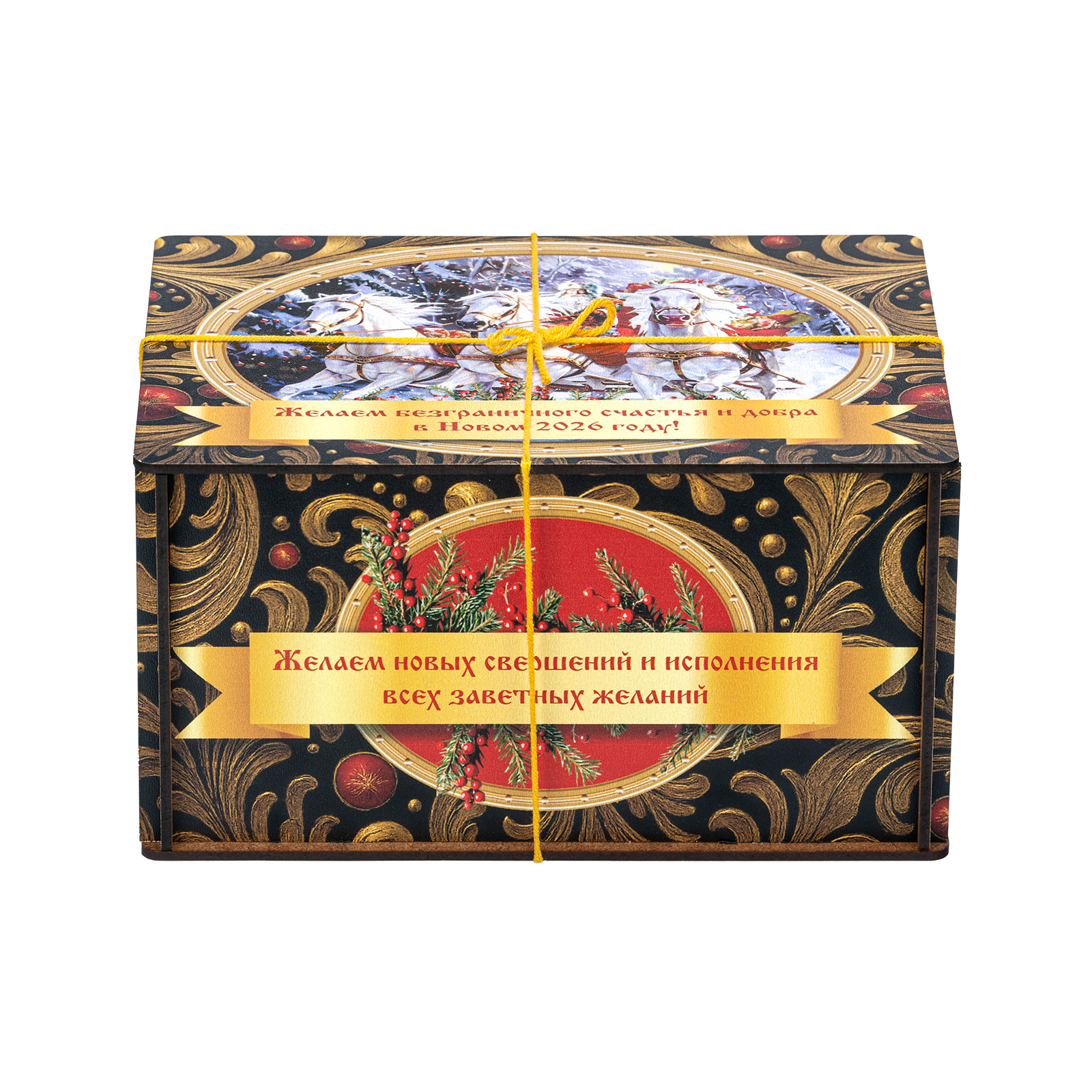 Интересный вариант новогоднего подарка – «Посылка Черный Бархат (Легенды Москвы)». Он представлен в разделе Дерево. Отлично подойдет на подарок в 2026 году с символом Лошадь. Внутри такого презента находится кондитерский набор весом 1500 граммов.