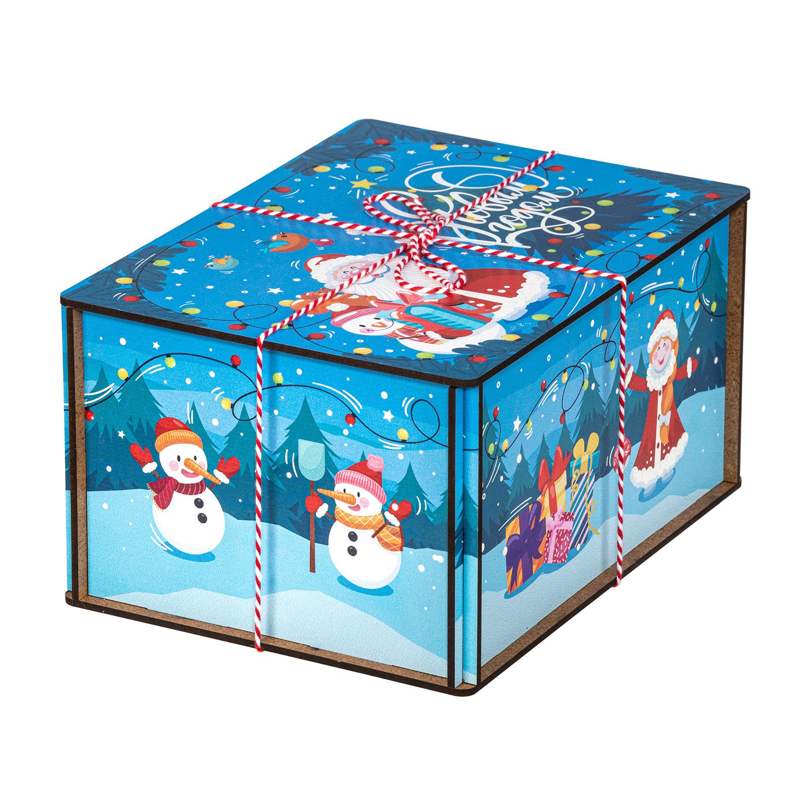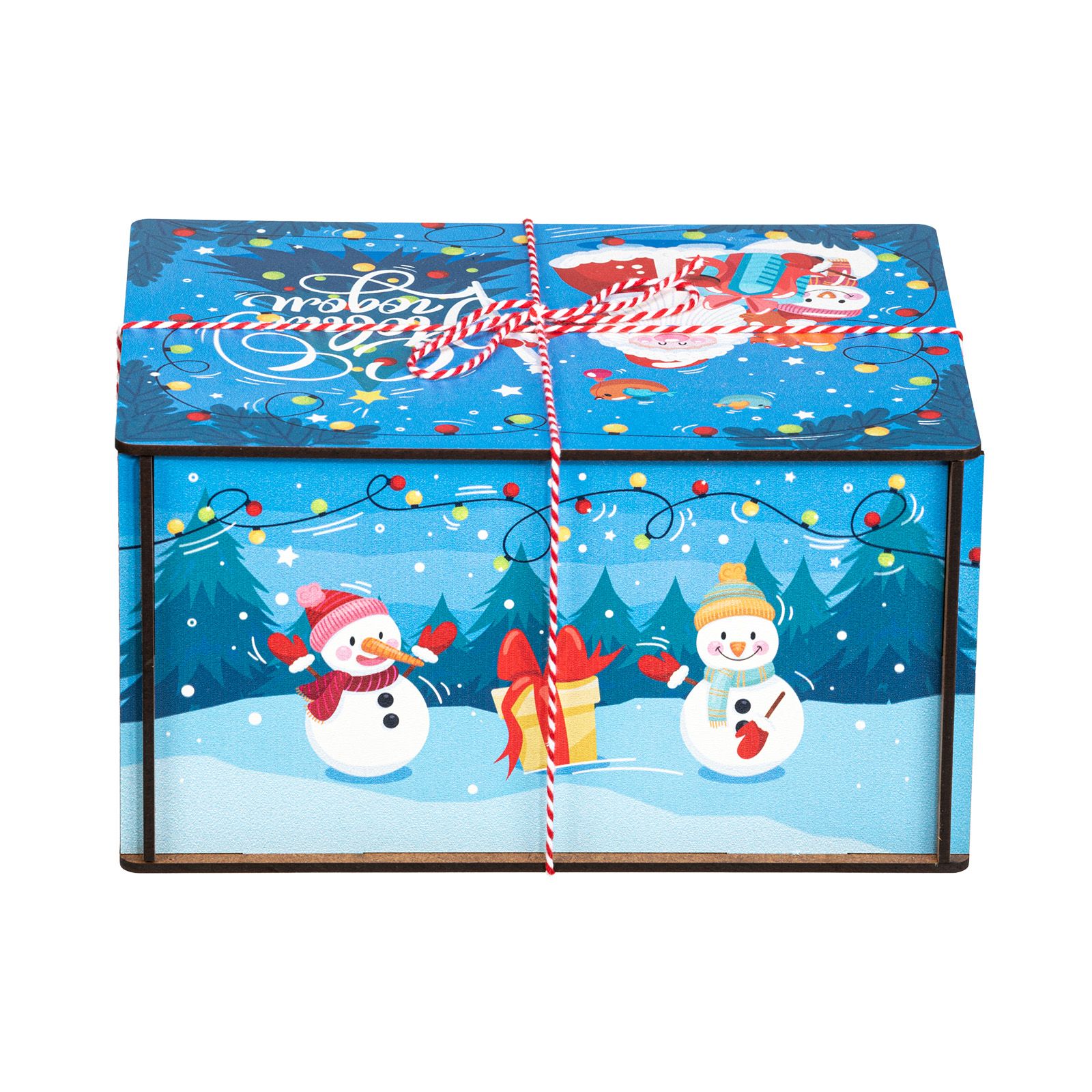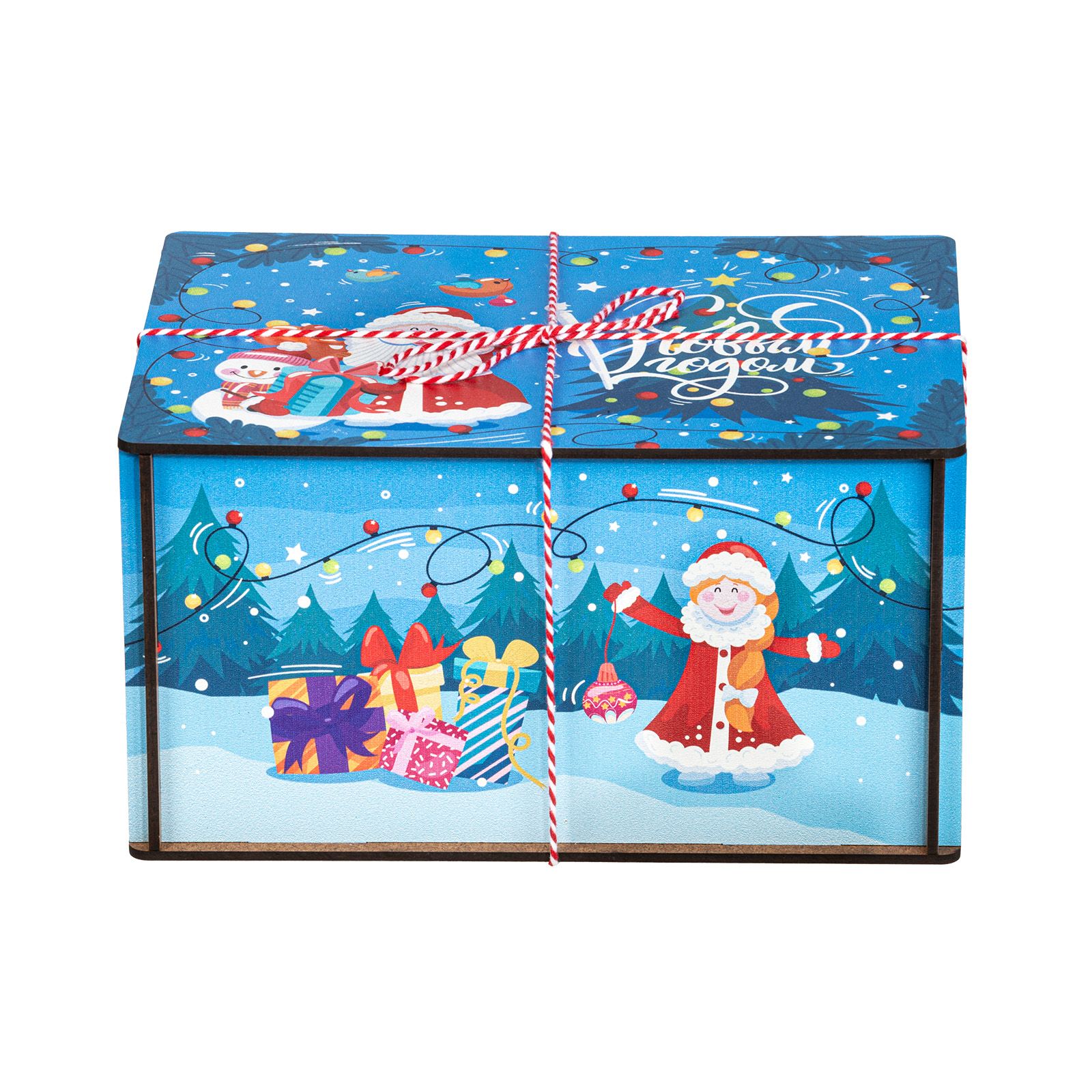 Если вы хотите подобрать интересный подарок для детей, то рекомендуем обратить внимание на презент «Посылка Гирлянды». Данный вариант представлен в упаковке из дерева. Размер короба 21*11*16 сантиметров. Общая цветовая гамма синяя. На рисунке Дедушка Мороз и Снеговичок как главные персонажи праздника. По краям декор их ветвей елок. Сладкое содержимое весом 1000 граммов пестрит разнообразием вкусов и ароматов. В составе есть шоколадные конфеты от легендарных фабрик, новинки от региональных, вкуснейшие десерты, печенье, вафли и многое другое. Отличное сочетание цены, веса и состава.
