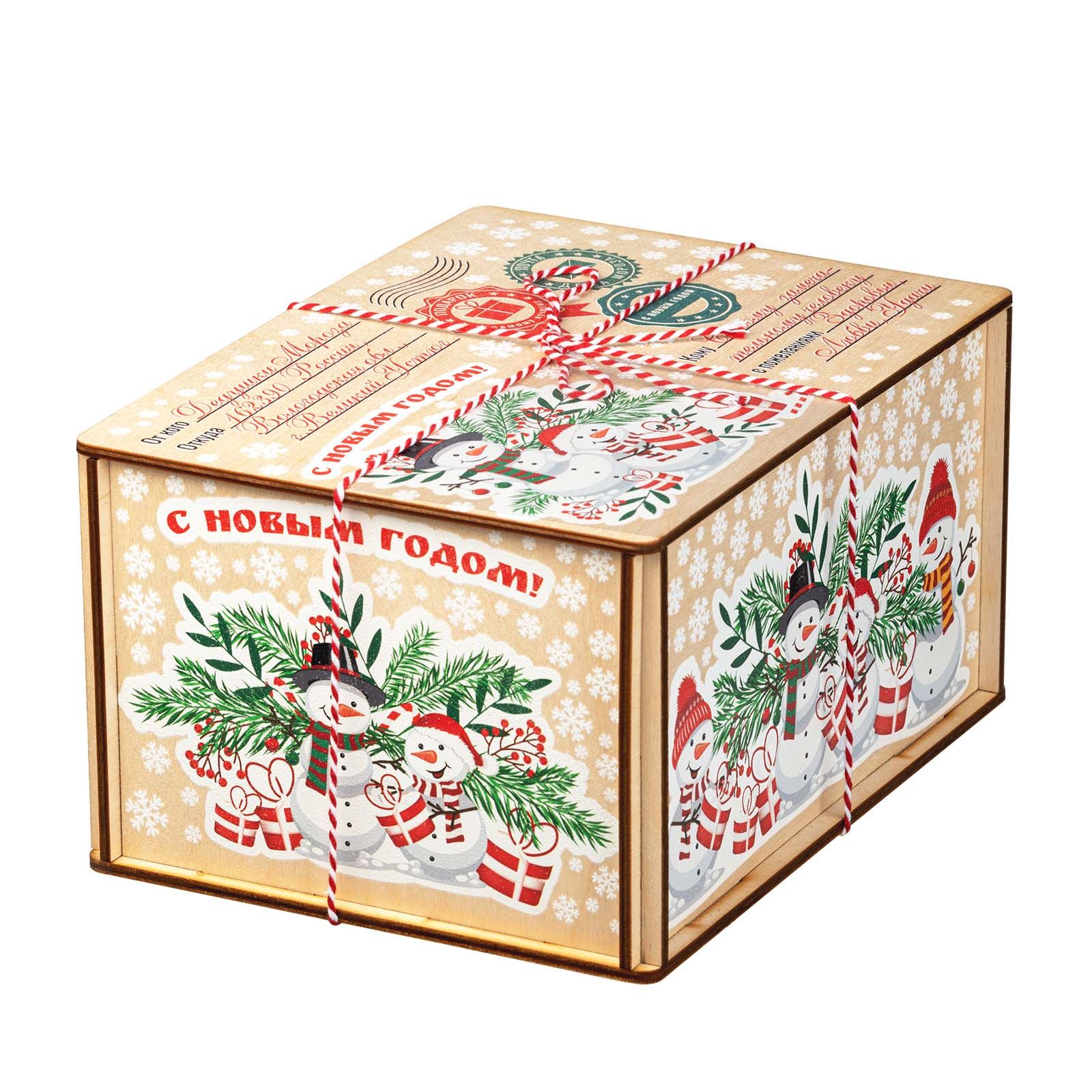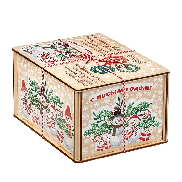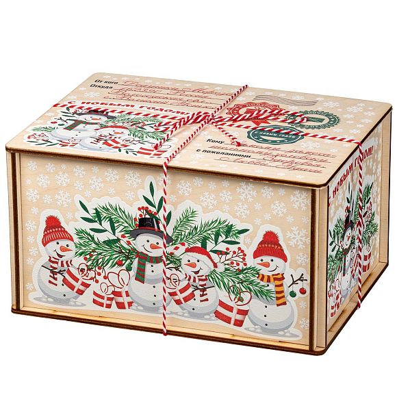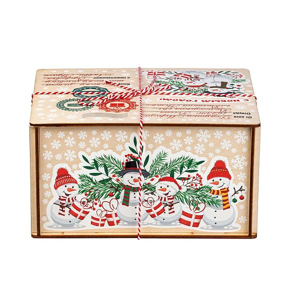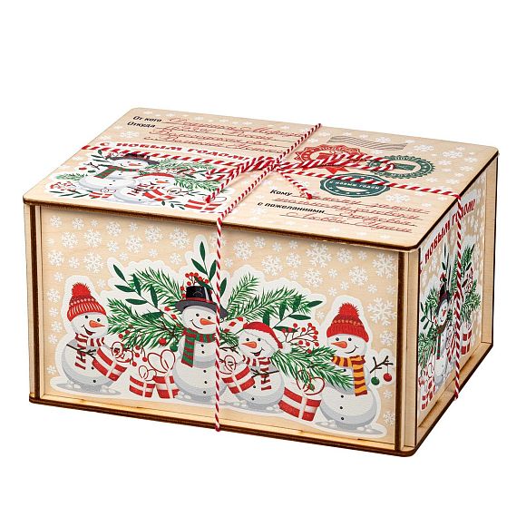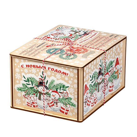 Подробнее о доставкеДеревянные посылки пользуются большим спросом из года в год, поэтому в нашей коллекции сладких новогодних подарков им уделяется отдельный раздел. Если вам нужен подарок, не привязанный к символу года, то предлагаем вариант «Посылка Снеговики». По форме это деревянный короб размером 21*11*16 сантиметров. На рисунке на верхней части пара озорных снеговичков на фоне еловых и рябиновых веток. Есть строчки от кого и для кого посылка. Также есть почтовая символика и белоснежные снежинки по всем граням упаковки. Сладкий набор под крышкой, вес 1000 граммов. Отборные кондитерские изделия от проверенных временем фабрик нашей страны, отличные новинки в ярком этикете – все только лучшее для вас и ваших детей.