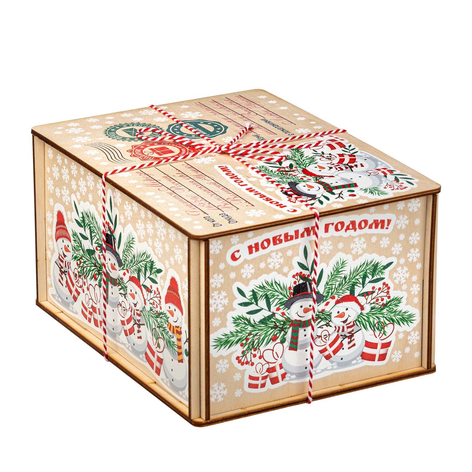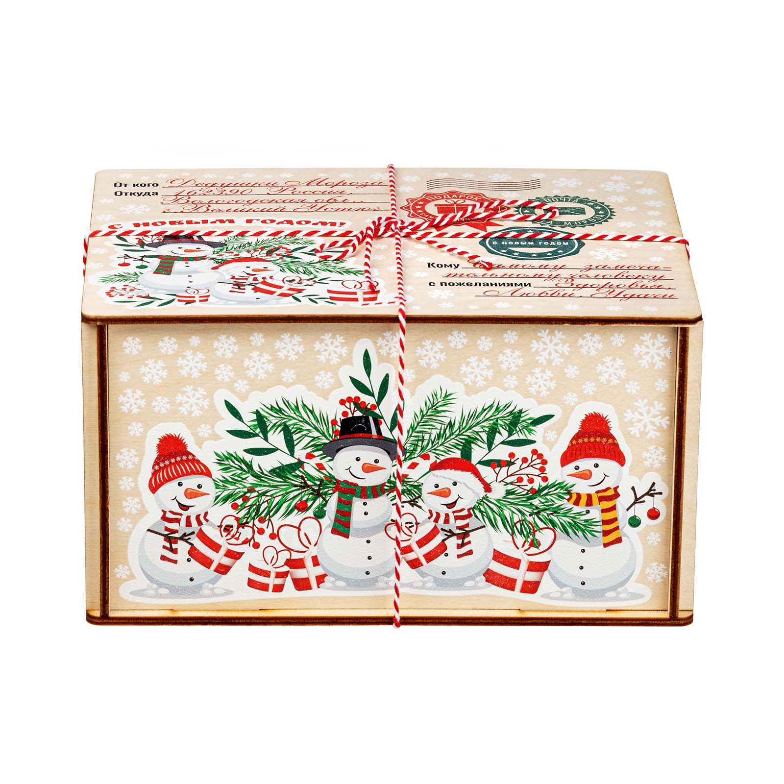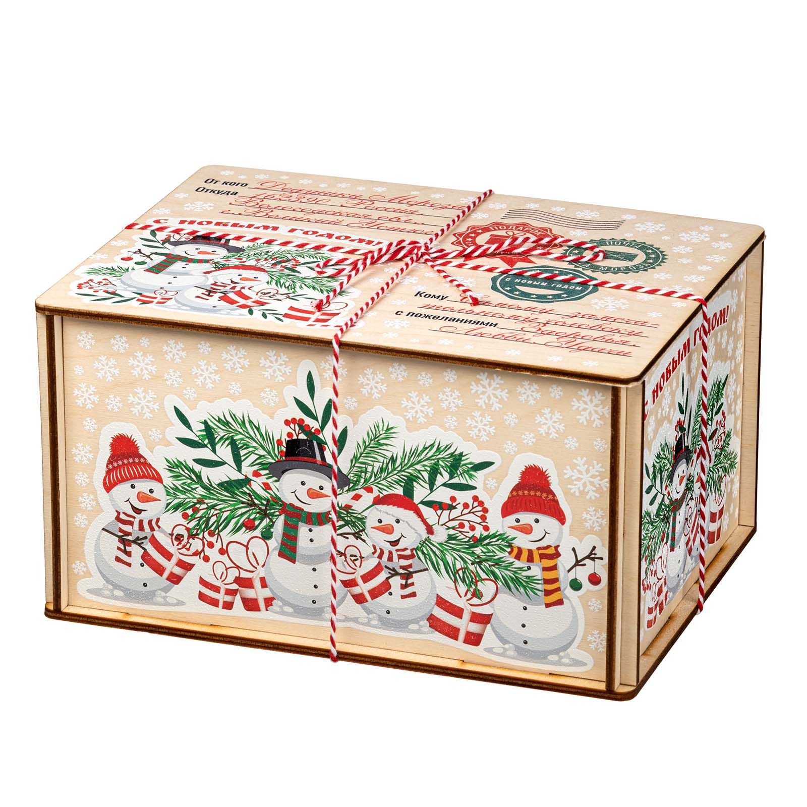 Подробнее о доставкеДеревянные посылки пользуются большим спросом из года в год, поэтому в нашей коллекции сладких новогодних подарков им уделяется отдельный раздел. Если вам нужен подарок, не привязанный к символу года, то предлагаем вариант «Посылка Снеговики». По форме это деревянный короб размером 21*11*16 сантиметров. На рисунке на верхней части пара озорных снеговичков на фоне еловых и рябиновых веток. Есть строчки от кого и для кого посылка. Также есть почтовая символика и белоснежные снежинки по всем граням упаковки. Сладкий набор под крышкой, вес 1000 граммов. Отборные кондитерские изделия от проверенных временем фабрик нашей страны, отличные новинки в ярком этикете – все только лучшее для вас и ваших детей.