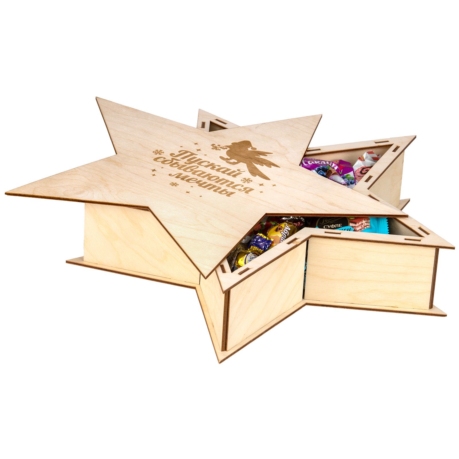 Подробнее о доставкеЕсли вы рассматриваете подарок из категории дерево, то мы посоветуем обратить внимание на – «Праздничная звезда». Подарок сделан из деревянного материала в виде звезды размером 36*36*7. В центре звезды изображена птичка в новогодней шляпке, а в клюве она держит веточку рябины. Рядом с ней находится новогоднее пожелание. . Внутри мы приготовили для вас специальный состав, который придется по нраву взрослым сладкоежкам. В нём множество сухофруктов в шоколаде, порционные десерты и другие вкусности. Вес кондитерского наполнения 1000 грамм. Подарок отлично подойдет для корпоративных праздников и мероприятий.