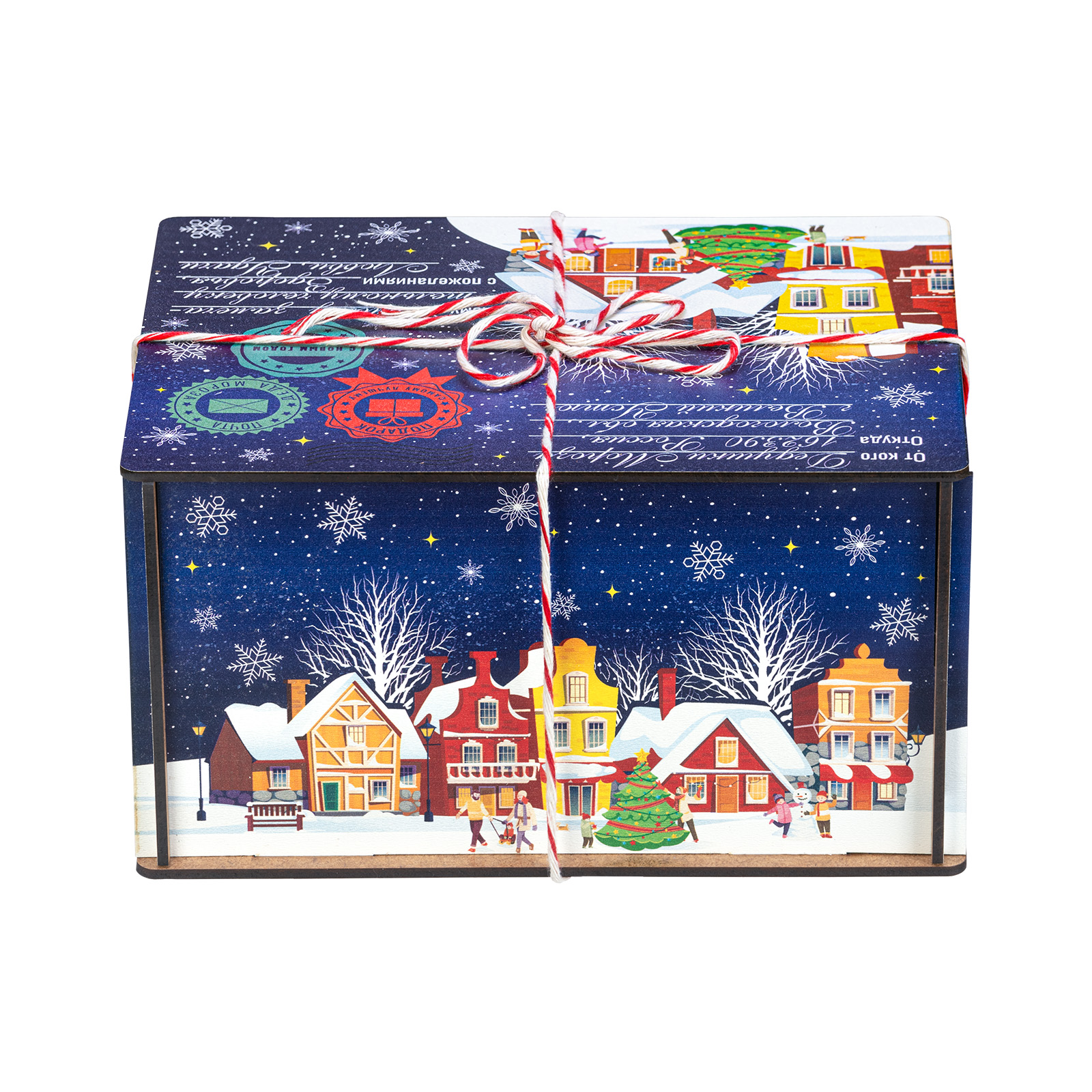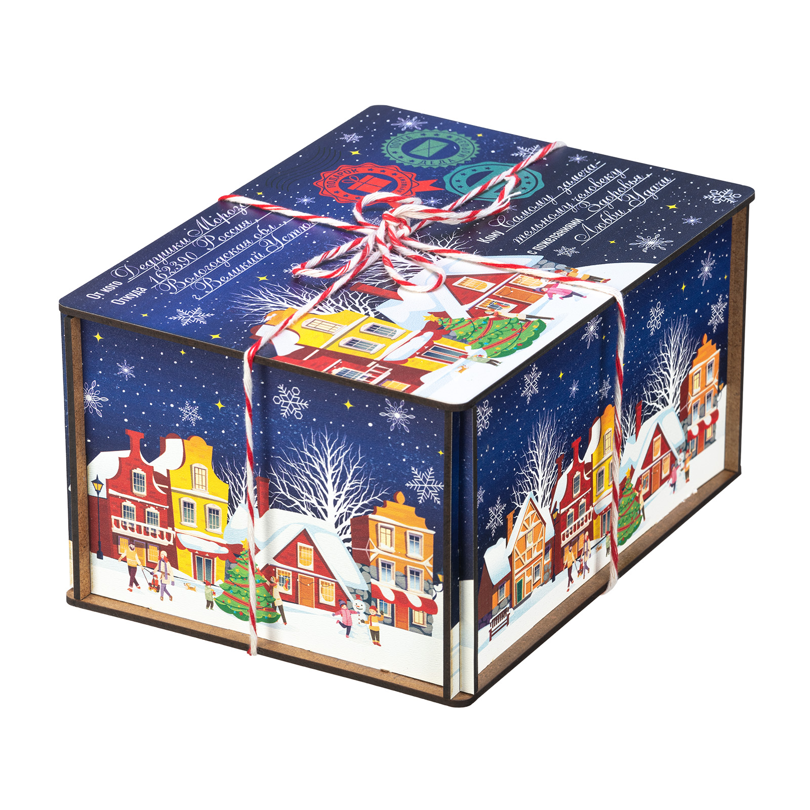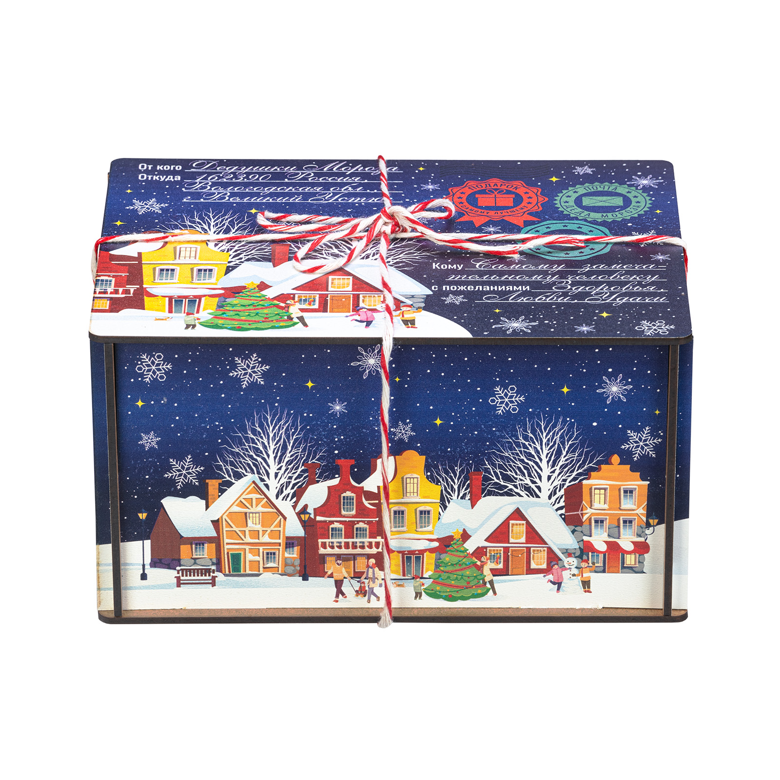 “Сияние ночи” - это новогодний сладкий подарок, который идеально в себе сочетает неповторимый вкус любимых сладостей и креативную оригинальную упаковку. Сладости бережно спрятаны в небольшой деревянный ящичек, украшенный со всех сторон разнообразными праздничными иллюстрациями в виде небольшого зимнего городка. Сверху упаковка закрыта удобной крышкой, оформленной в стиле посылки - посмотрите, даже фирменные печати есть! Внутри этого подарка находится килограмм разнообразных отборных сладостей и небольшой памятный сувенир. Такой подарочный набор универсален - его с легкостью можно вручить как взрослому, так и ребенку - восторг гарантирован в любом случае!