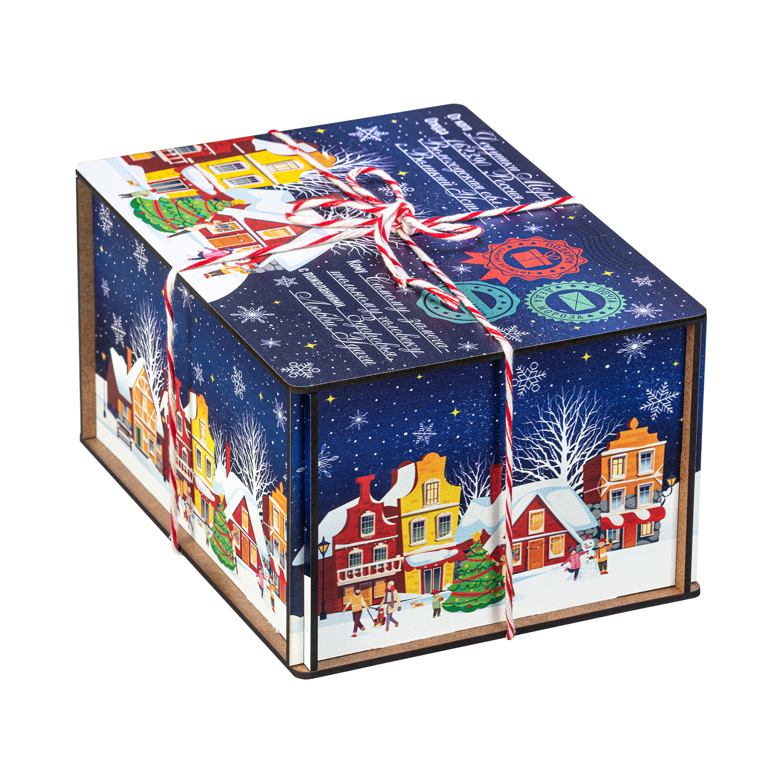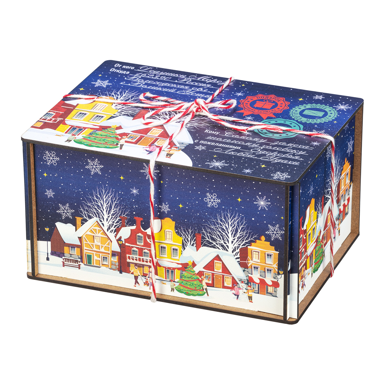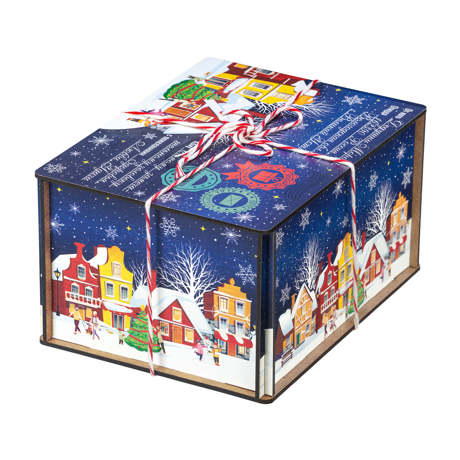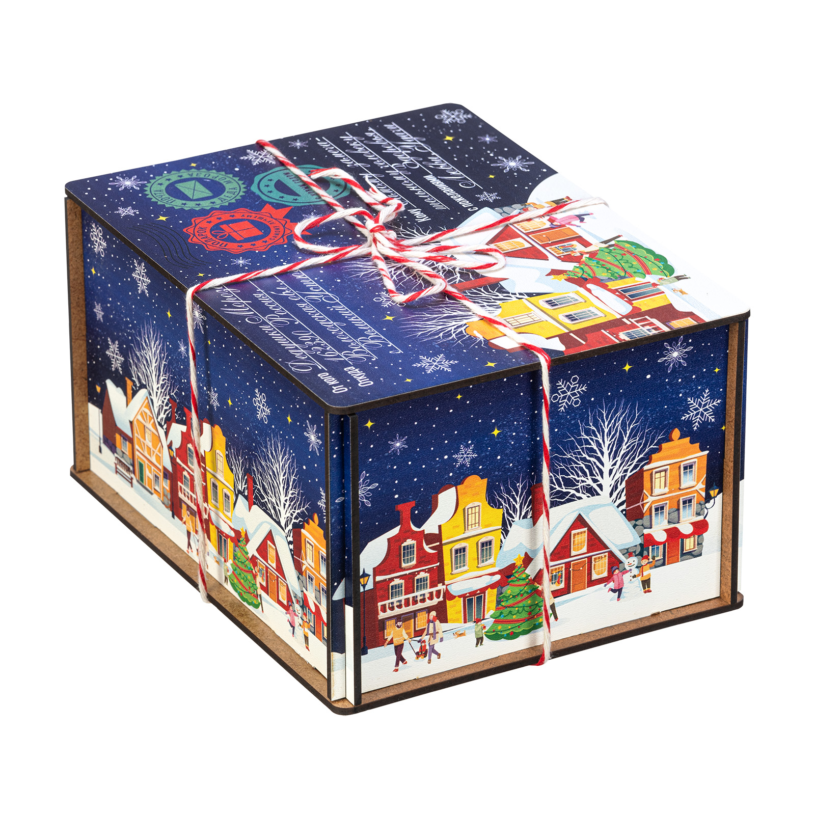 “Сияние ночи” - это новогодний сладкий подарок, который идеально в себе сочетает неповторимый вкус любимых сладостей и креативную оригинальную упаковку. Сладости бережно спрятаны в небольшой деревянный ящичек, украшенный со всех сторон разнообразными праздничными иллюстрациями в виде небольшого зимнего городка. Сверху упаковка закрыта удобной крышкой, оформленной в стиле посылки - посмотрите, даже фирменные печати есть! Внутри этого подарка находится килограмм разнообразных отборных сладостей и небольшой памятный сувенир. Такой подарочный набор универсален - его с легкостью можно вручить как взрослому, так и ребенку - восторг гарантирован в любом случае!