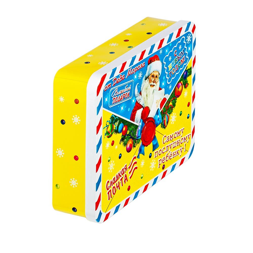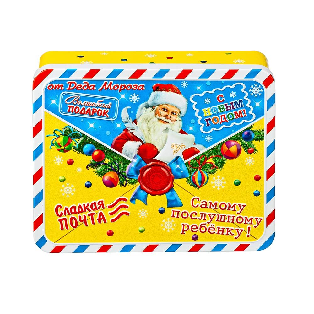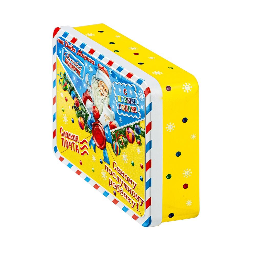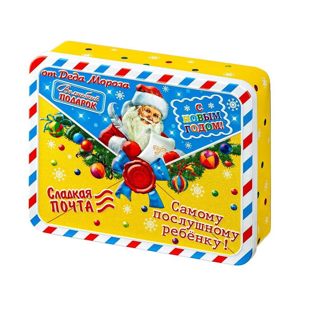 Новогодний подарок «Сладкая почта» оформлен в виде металлической баночки прямоугольной формы с изображением Дедушки Мороза, а внутри сладкое наполнение, общим весом 200 грамм. Представленный подарок хорошо подойдет для тех детишек, чьи мамы очень внимательно следят за количеством съеденных ими сладостей. Приятным сюрпризом станет вложение в виде новогоднего сувенира. Когда все угощения будут съедены, то баночку можно использовать в быту. Например, хранить в ней поздравительные открытки и письма.