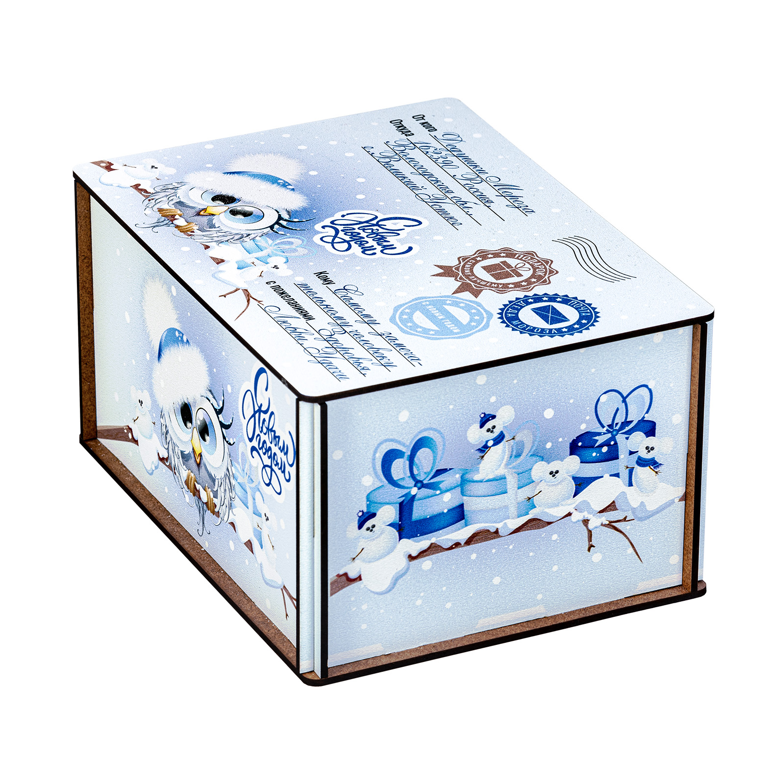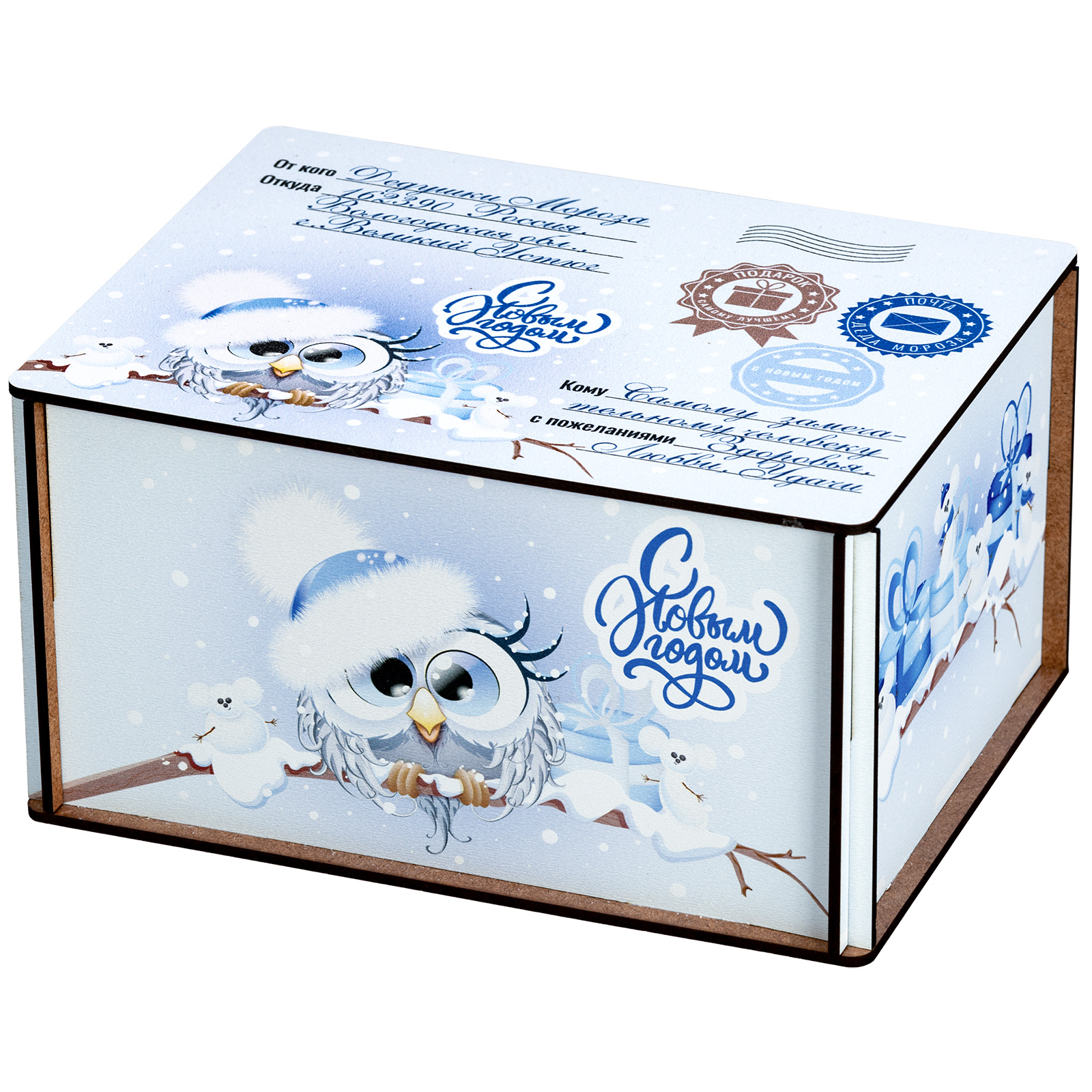 Новогодние сладкие подарки в виде небольшого деревянного ящика - это прекрасный вариант презента для взрослого сластены. Ведь таким образом можно даже самого строгого и делового человека на миг перенести в светлое и беззаботное детство. Набор “Совушки”  - это небольшая деревянная бандероль нежно-голубого цвета, украшенная со всех сторон рисунками с очаровательными совятами в милых зимних шапочках. Крышка этой бандероли оформлена под самую настоящую посылку: там указан и отправитель, и получатель, и даже все печати на месте! А что же внутри посылки? Там находятся вкусные и разнообразные сладости, с которыми любое чаепитие в новогодние праздники станет самым настоящим сказочным торжеством!