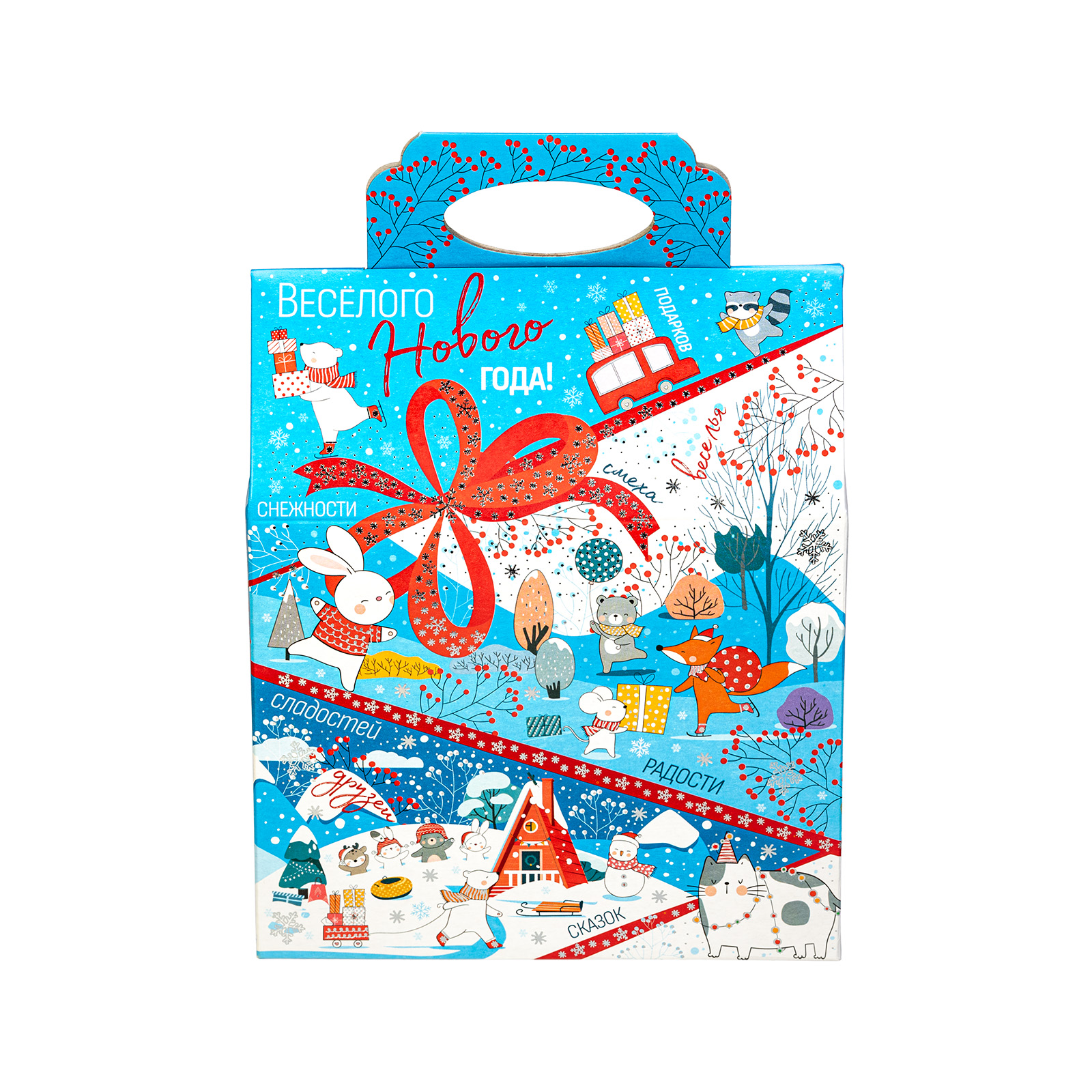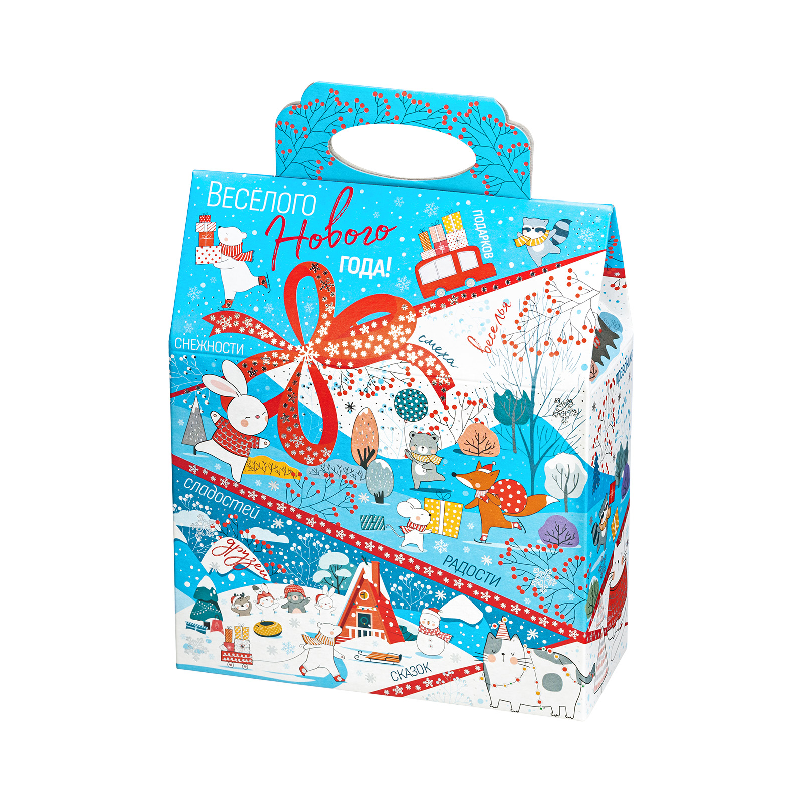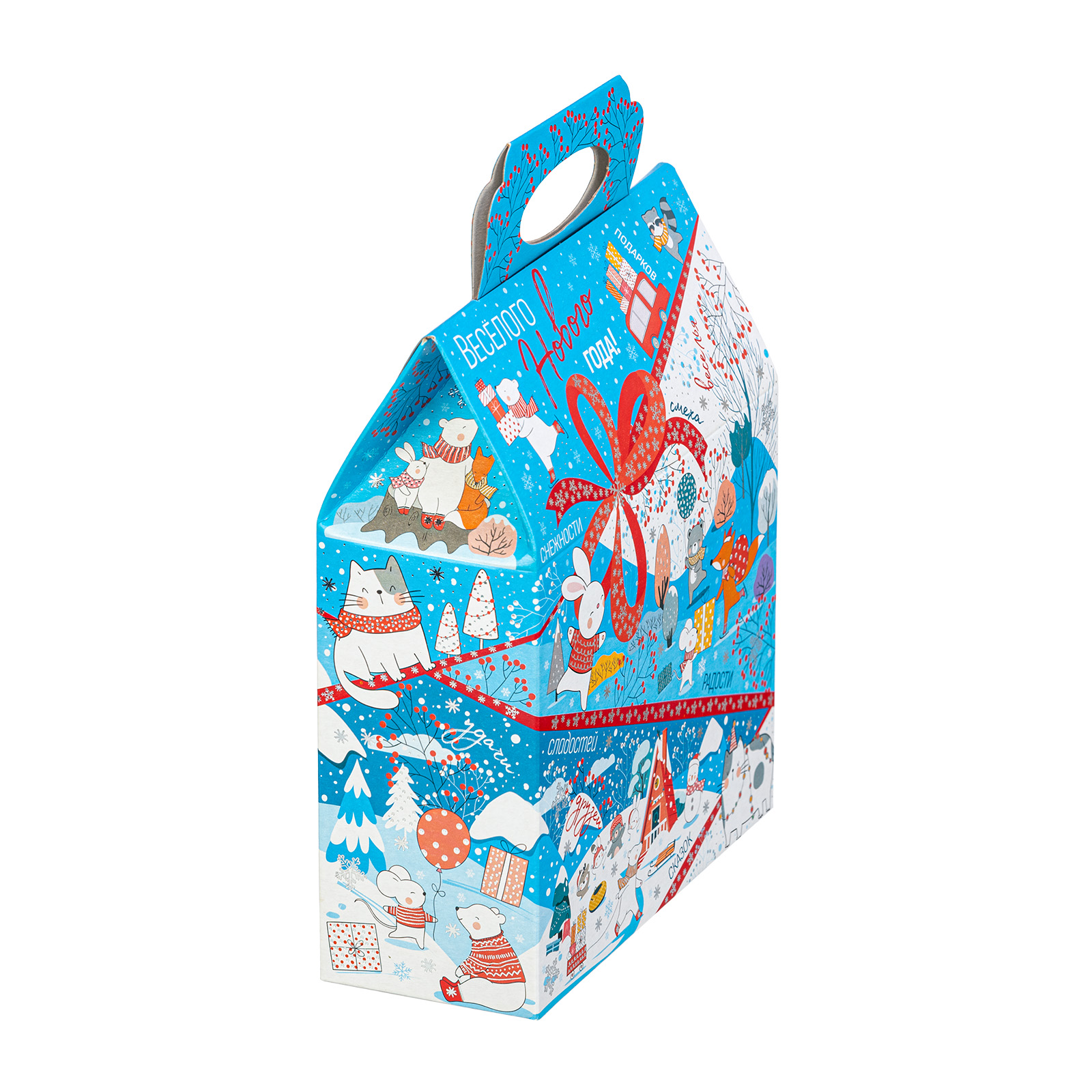 Новогодние сладкие подарки в картонной упаковке - это универсальный выбор для праздника в детском учреждении или корпоратива в крупной компании. Набор “Синее небо” - это небольшой, но безумно приятный сладкий подарок, которому порадуется сластена любого возраста. Подарочная упаковка представляет собой небольшую картонную сумочку нежно-голубого цвета. Со всех сторон она украшена разнообразными забавными иллюстрациями, на который веселые зверята уже во всю погрузились в предновогодние хлопоты. Помимо привлекательной упаковки подарок может порадовать разнообразным сладким наполнением, в котором каждый сможет найти себе лакомство по вкусу!