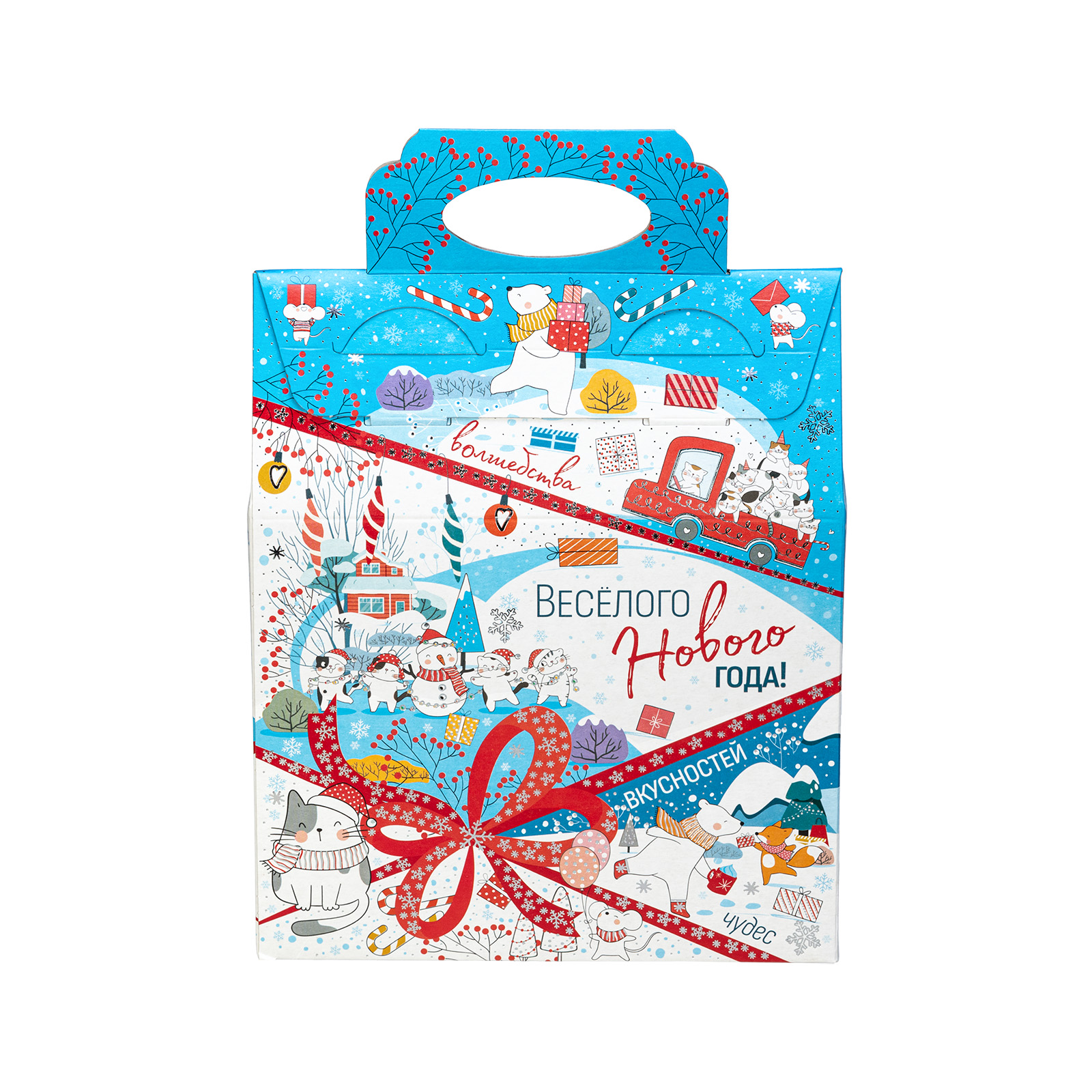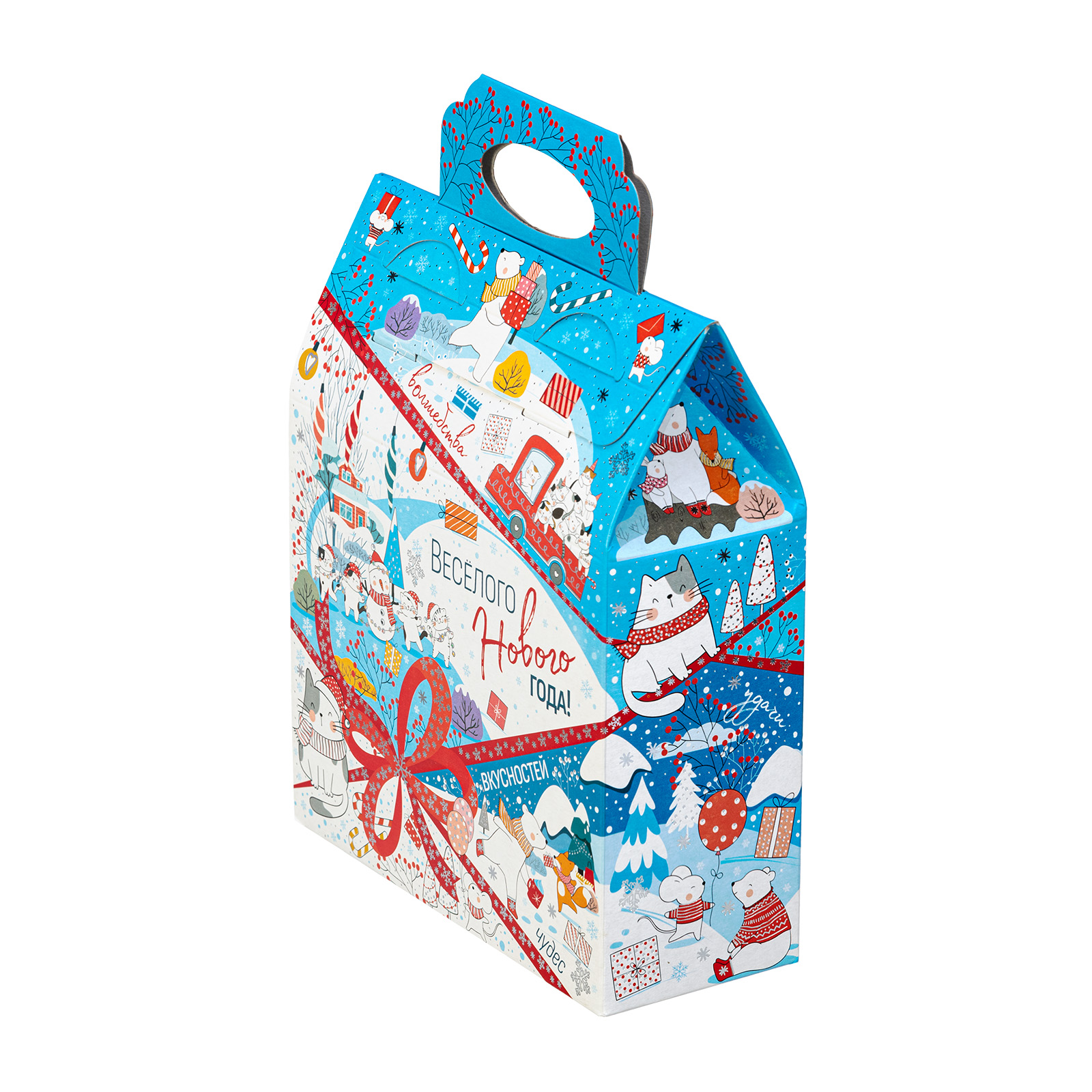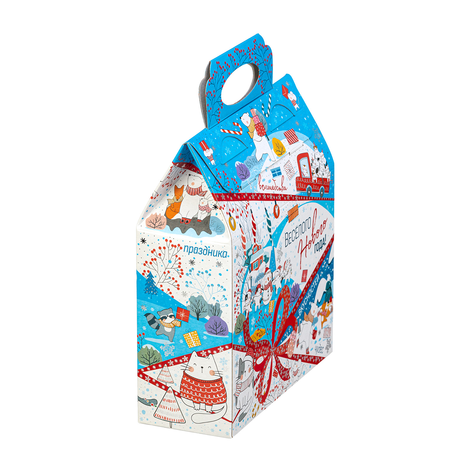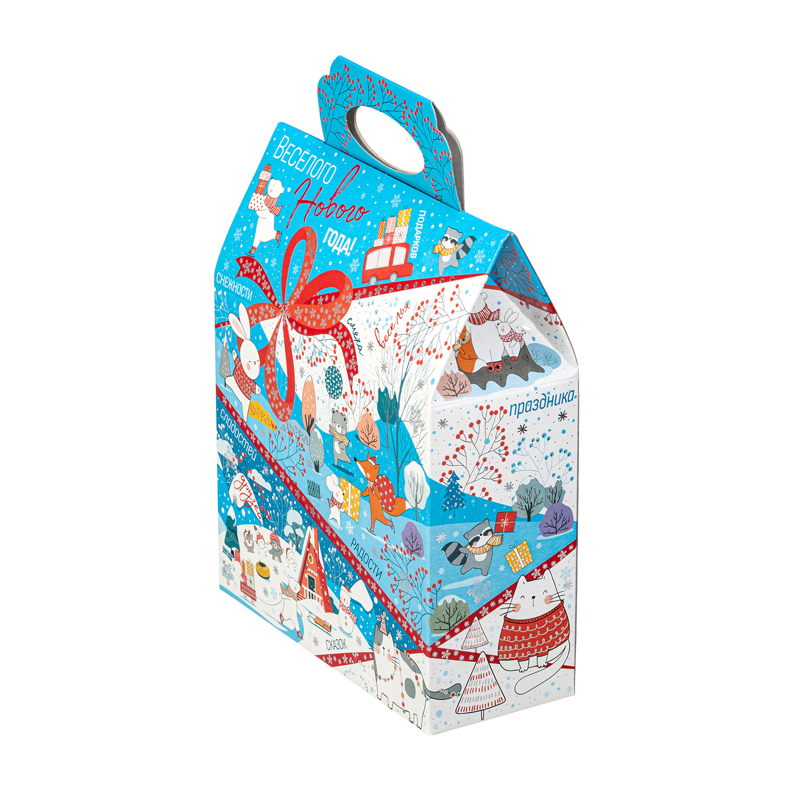 Новогодние сладкие подарки в картонной упаковке - это универсальный выбор для праздника в детском учреждении или корпоратива в крупной компании. Набор “Синее небо” - это небольшой, но безумно приятный сладкий подарок, которому порадуется сластена любого возраста. Подарочная упаковка представляет собой небольшую картонную сумочку нежно-голубого цвета. Со всех сторон она украшена разнообразными забавными иллюстрациями, на который веселые зверята уже во всю погрузились в предновогодние хлопоты. Помимо привлекательной упаковки подарок может порадовать разнообразным сладким наполнением, в котором каждый сможет найти себе лакомство по вкусу!