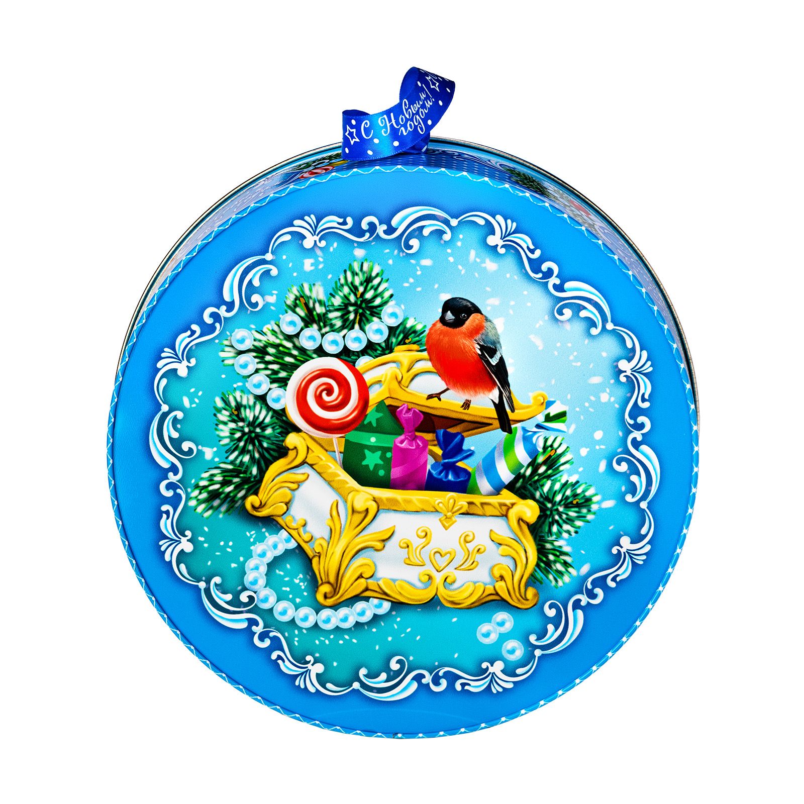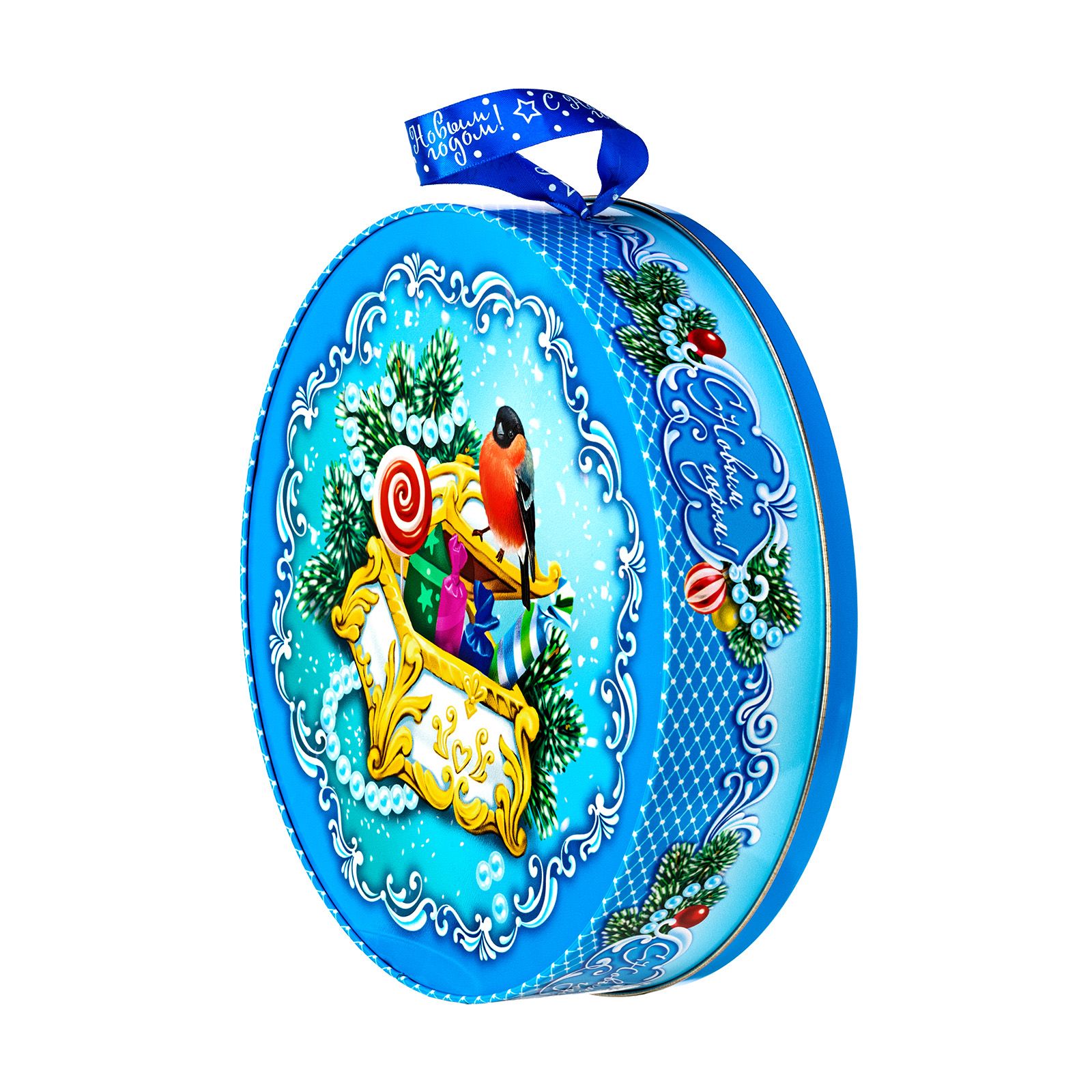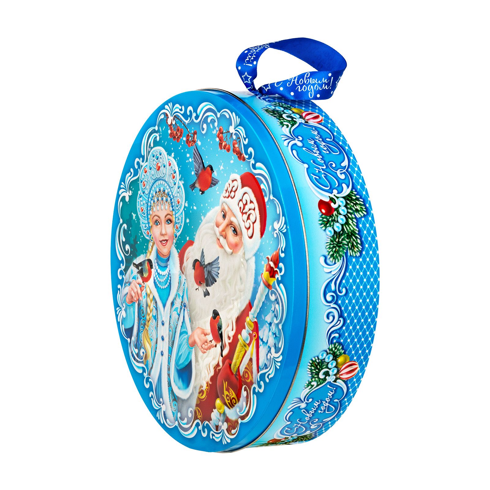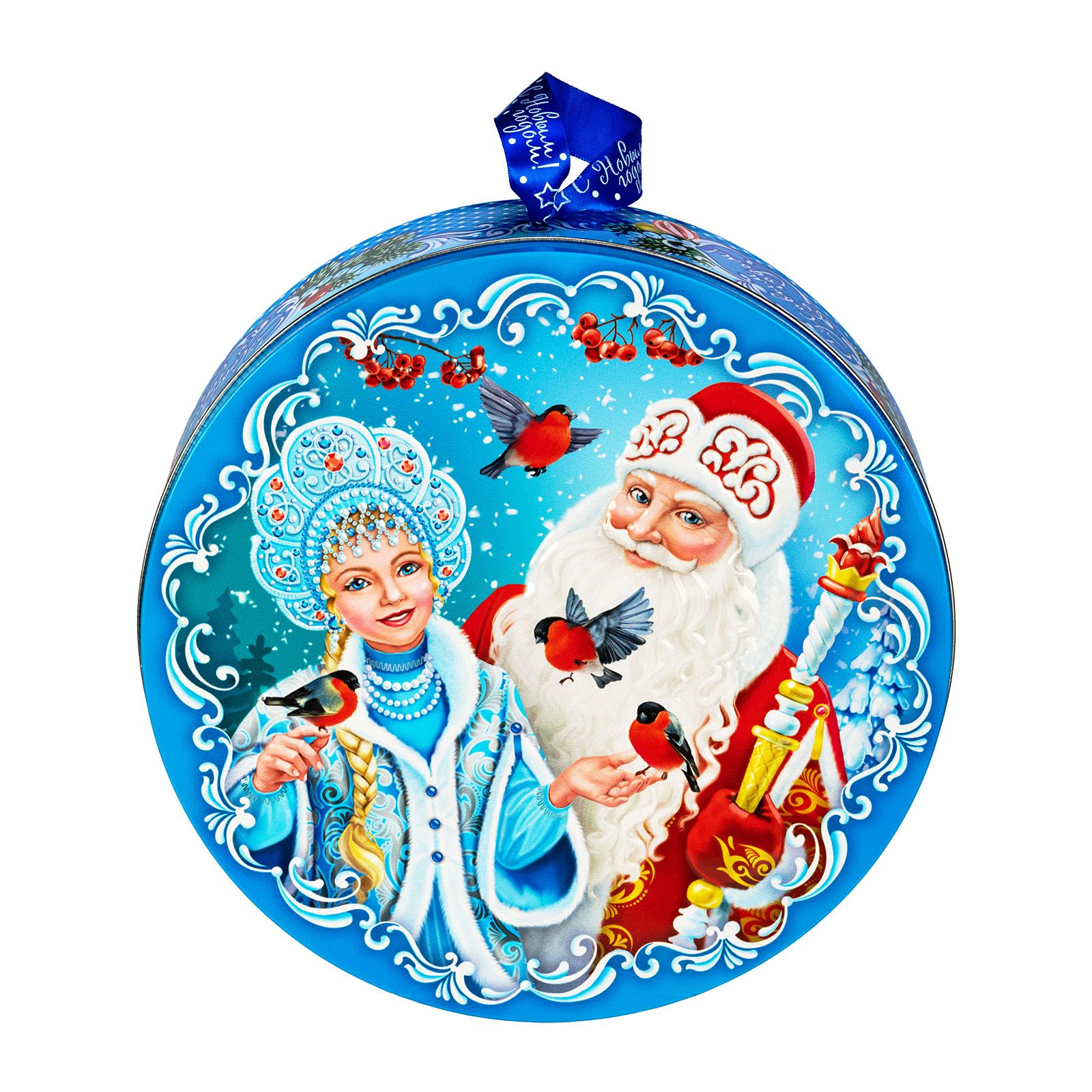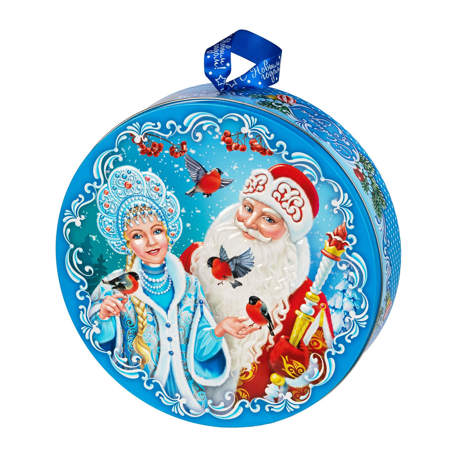 “Традиции декабря” - это чудесный новогодний подарок, который одинаково хорошо дополнит как детский утренник, так и корпоратив в крупной компании. Разнообразные вкусные сладости в нем бережно упакованы в круглую жестяную коробочку со съемной крышкой. Сама коробочка приятного небесно-голубого цвета, украшенная со всех сторон новогодними иллюстрациями. Самая яркая из них располагается на крышке: там главные волшебники - Дедушка Мороз и Снегурочка - а с ними шумная стайка веселых снегирей. Видимо, волшебная семья устроила праздничное чаепитие и пригласила присоединиться к нему всех желающих. Посмотрите, сколько вкусных сладостей они приготовили для вас - с ними любой вечер станет самым настоящим праздником!