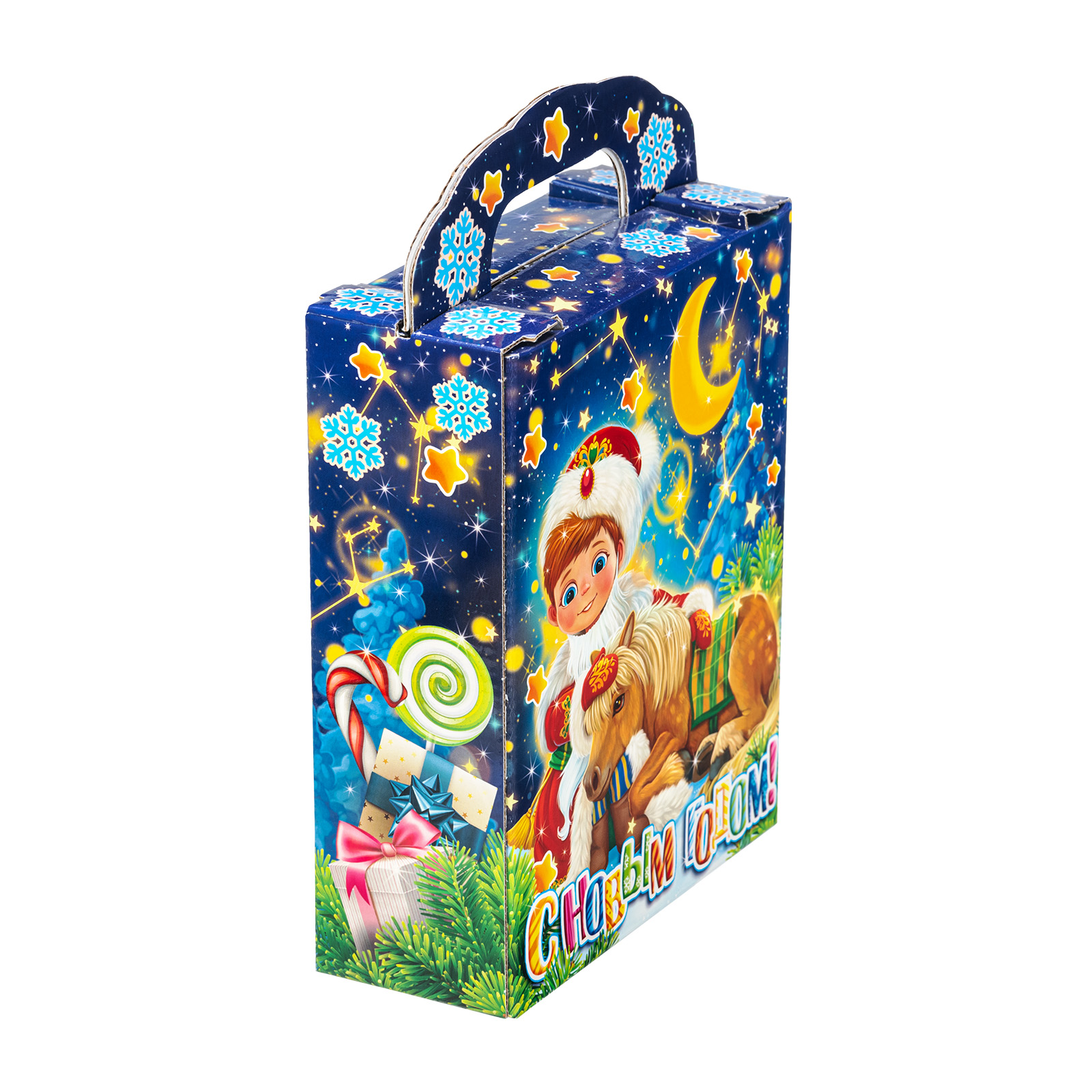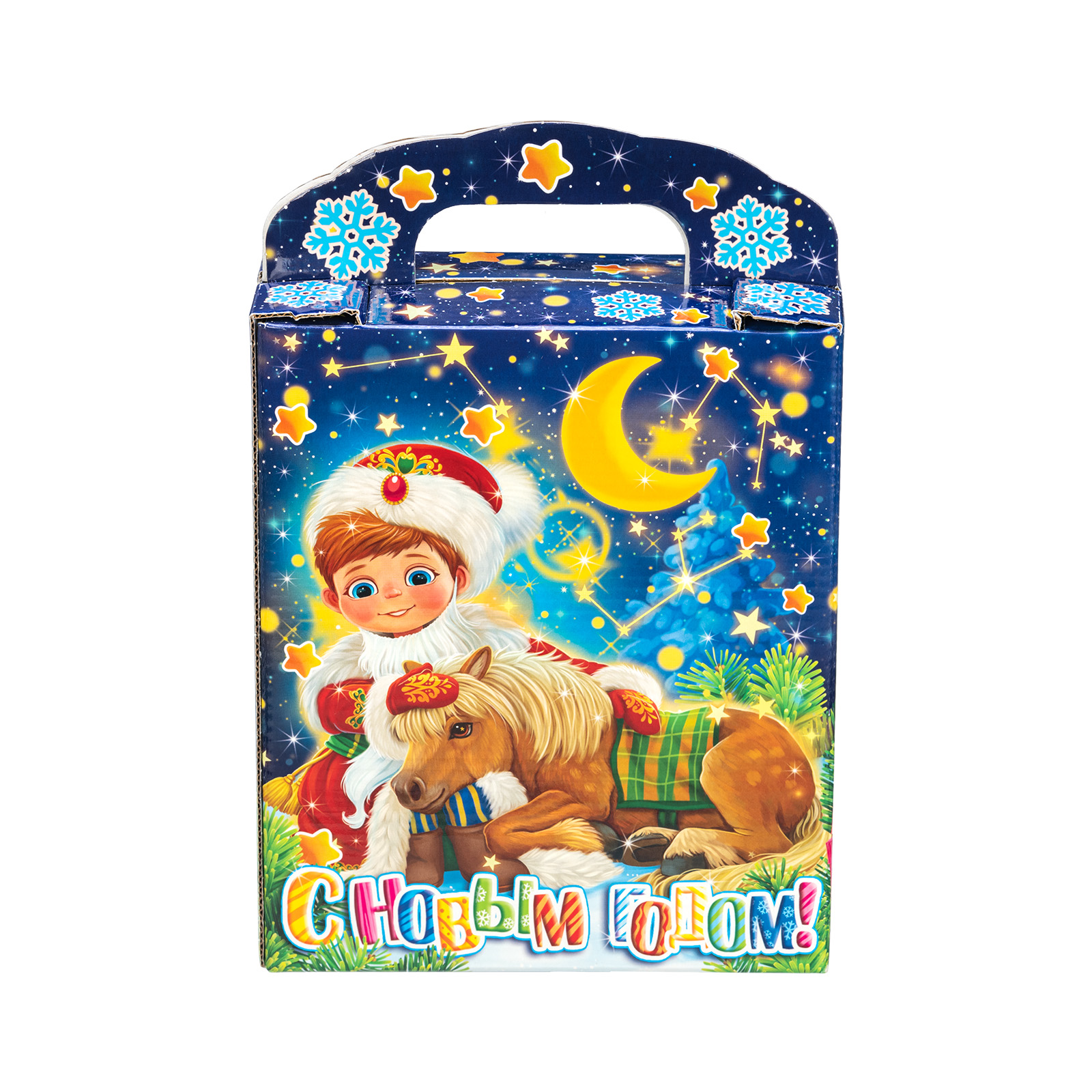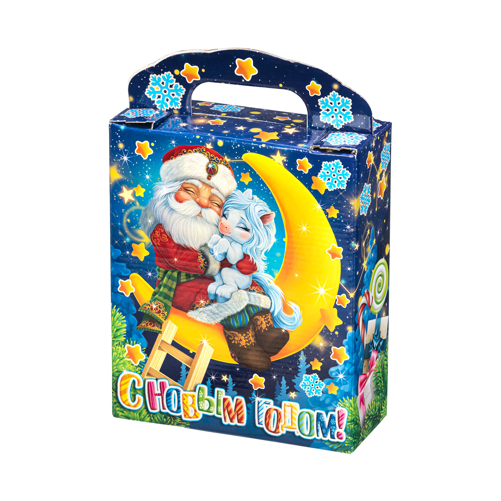 Небольшой, но довольно милый подарочный набор, при взгляде на который невольно начинаешь улыбаться и вспоминать о своих близких людях. Это небольшая картонная коробочка темно-синего цвета, украшенная различными праздничными рисунками. На передней части мы видим изображение Дедушки Мороза и маленькой белоснежной лошадки, сидящих в обнимку на полумесяце. Такой подарок прекрасно подойдет как для маленького, так и для совсем взрослого сластены. Внутри этой коробочки хранится 800 грамм самых разнообразных вкусных сладостей от ведущих кондитерских предприятий. С таким подарком праздничное настроение еще долгое время не покинет того человека, которому его вручили.