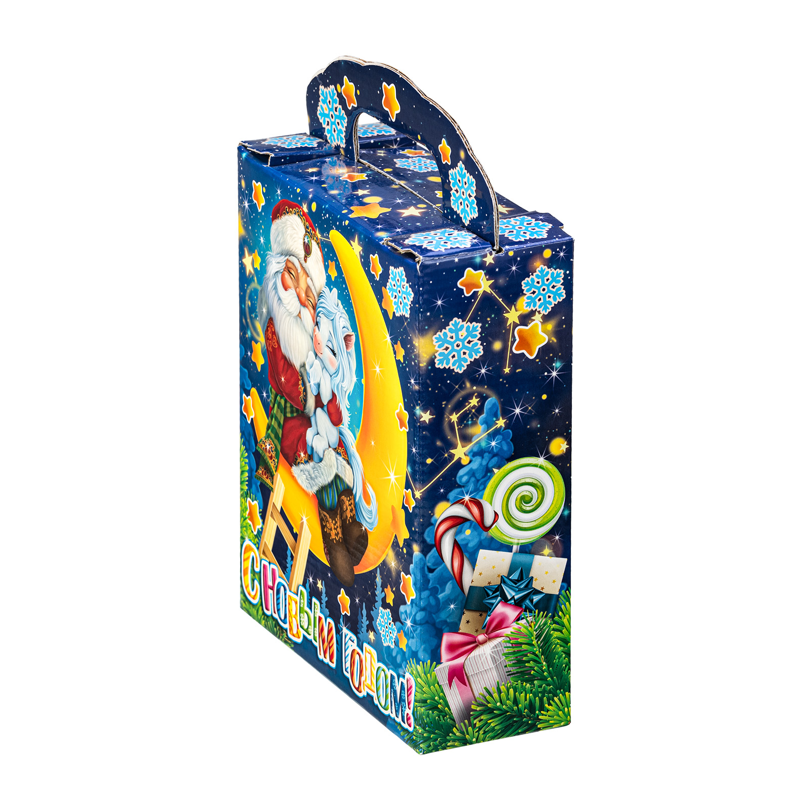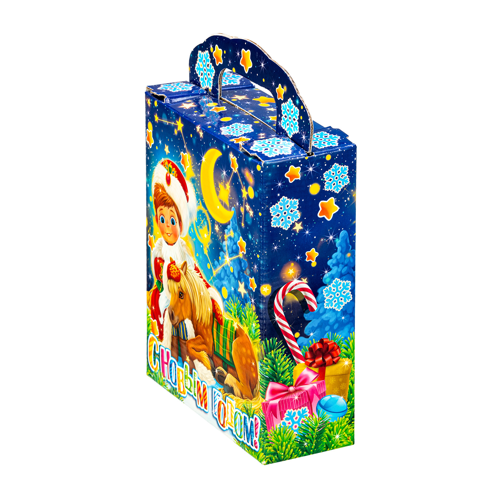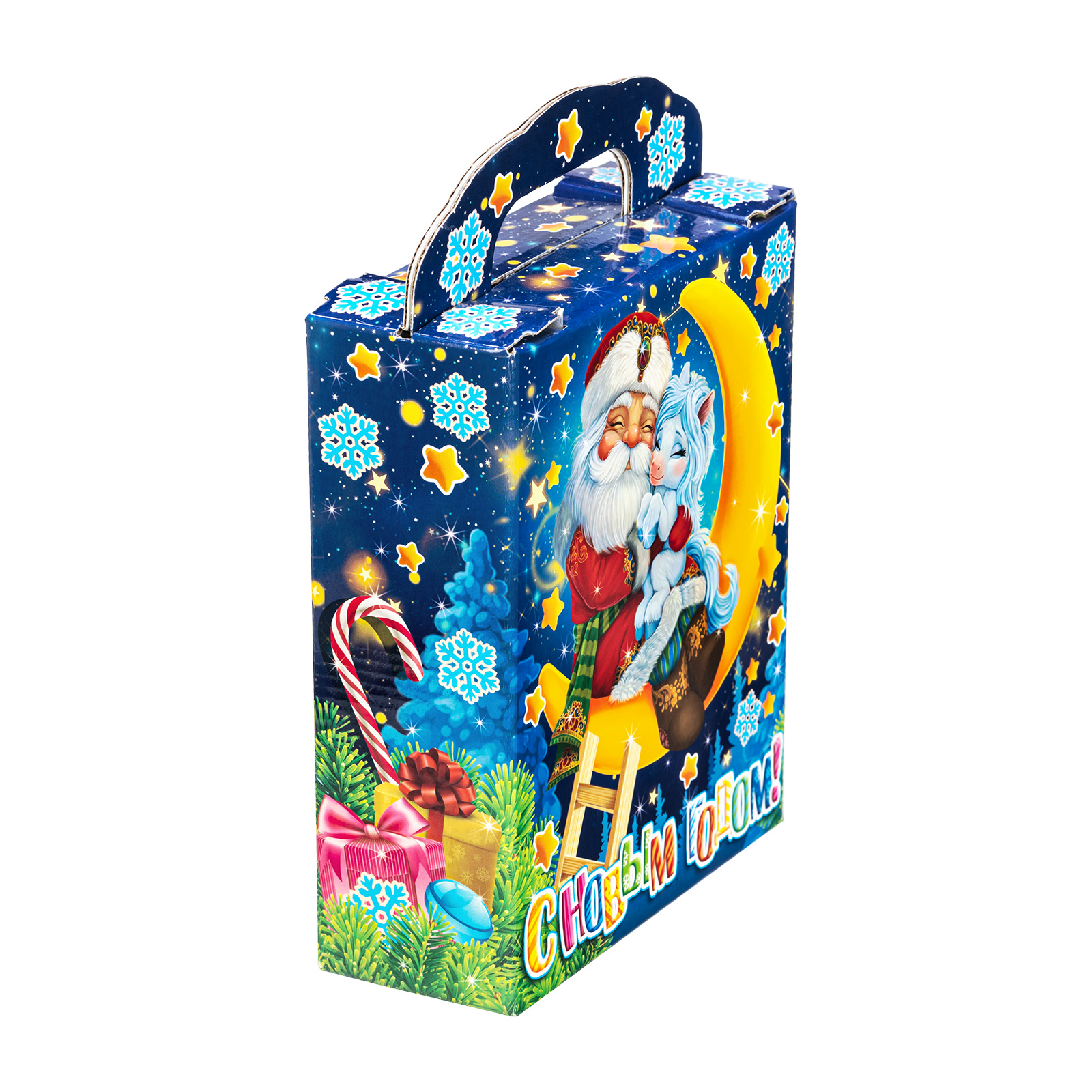 Небольшой, но довольно милый подарочный набор, при взгляде на который невольно начинаешь улыбаться и вспоминать о своих близких людях. Это небольшая картонная коробочка темно-синего цвета, украшенная различными праздничными рисунками. На передней части мы видим изображение Дедушки Мороза и маленькой белоснежной лошадки, сидящих в обнимку на полумесяце. Такой подарок прекрасно подойдет как для маленького, так и для совсем взрослого сластены. Внутри этой коробочки хранится 800 грамм самых разнообразных вкусных сладостей от ведущих кондитерских предприятий. С таким подарком праздничное настроение еще долгое время не покинет того человека, которому его вручили.