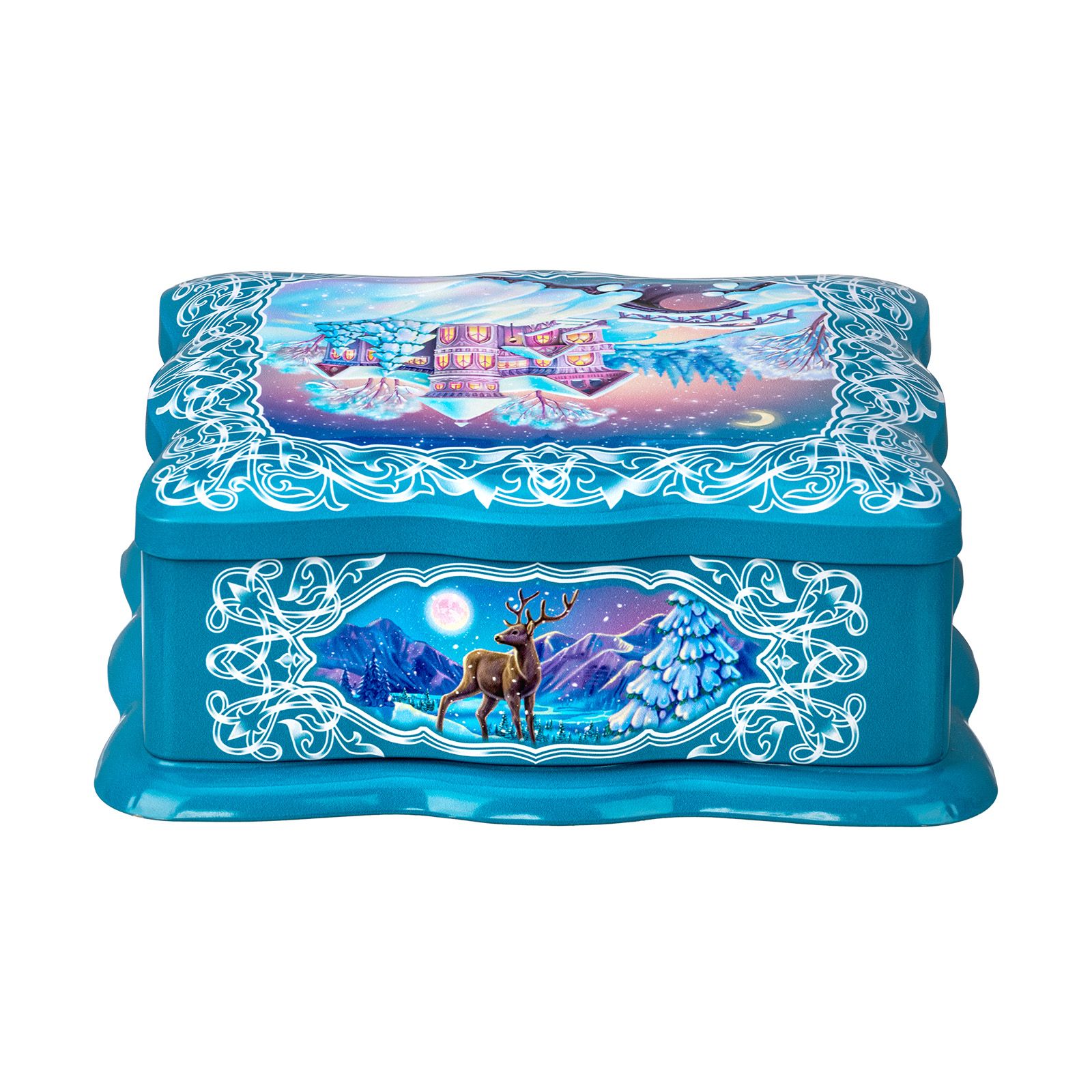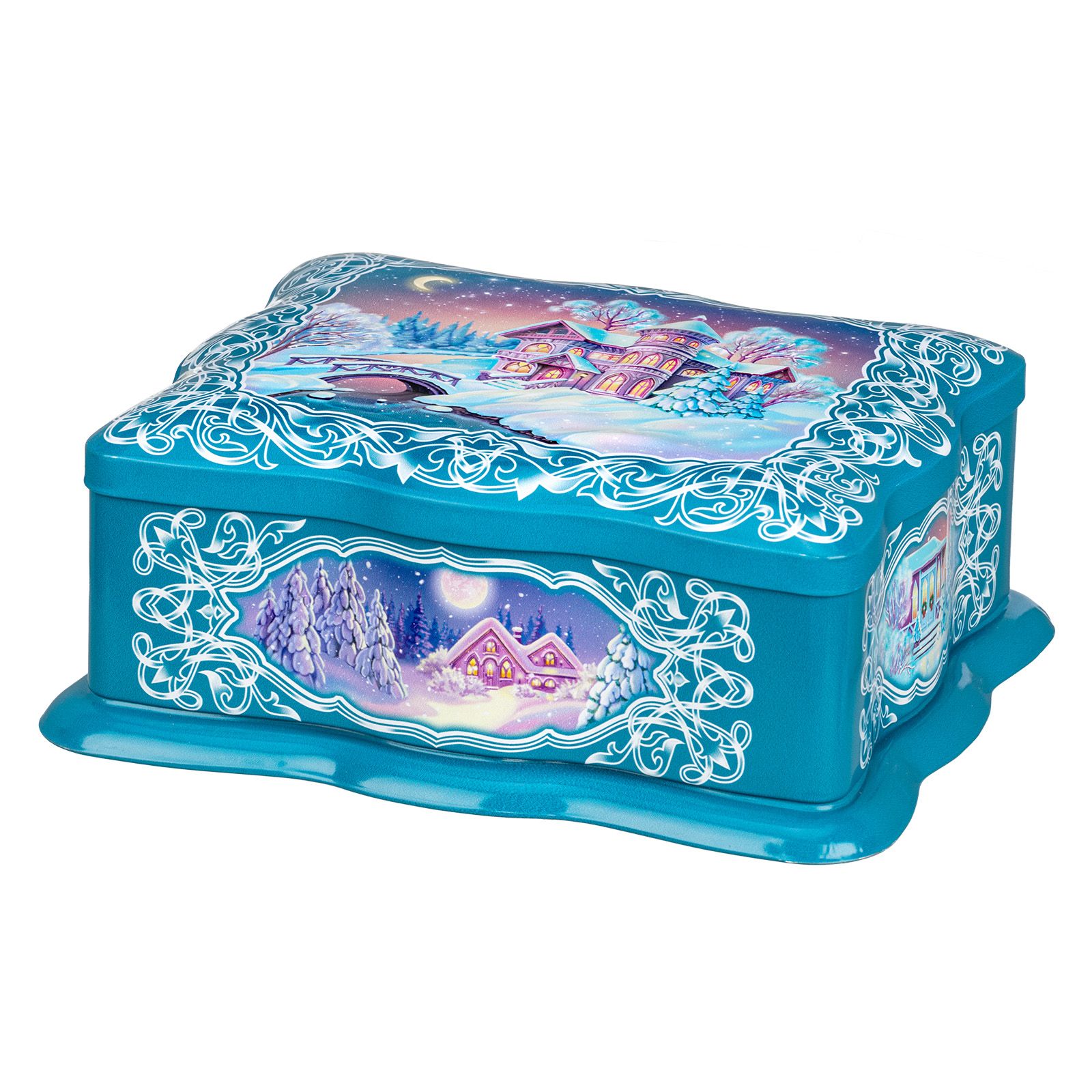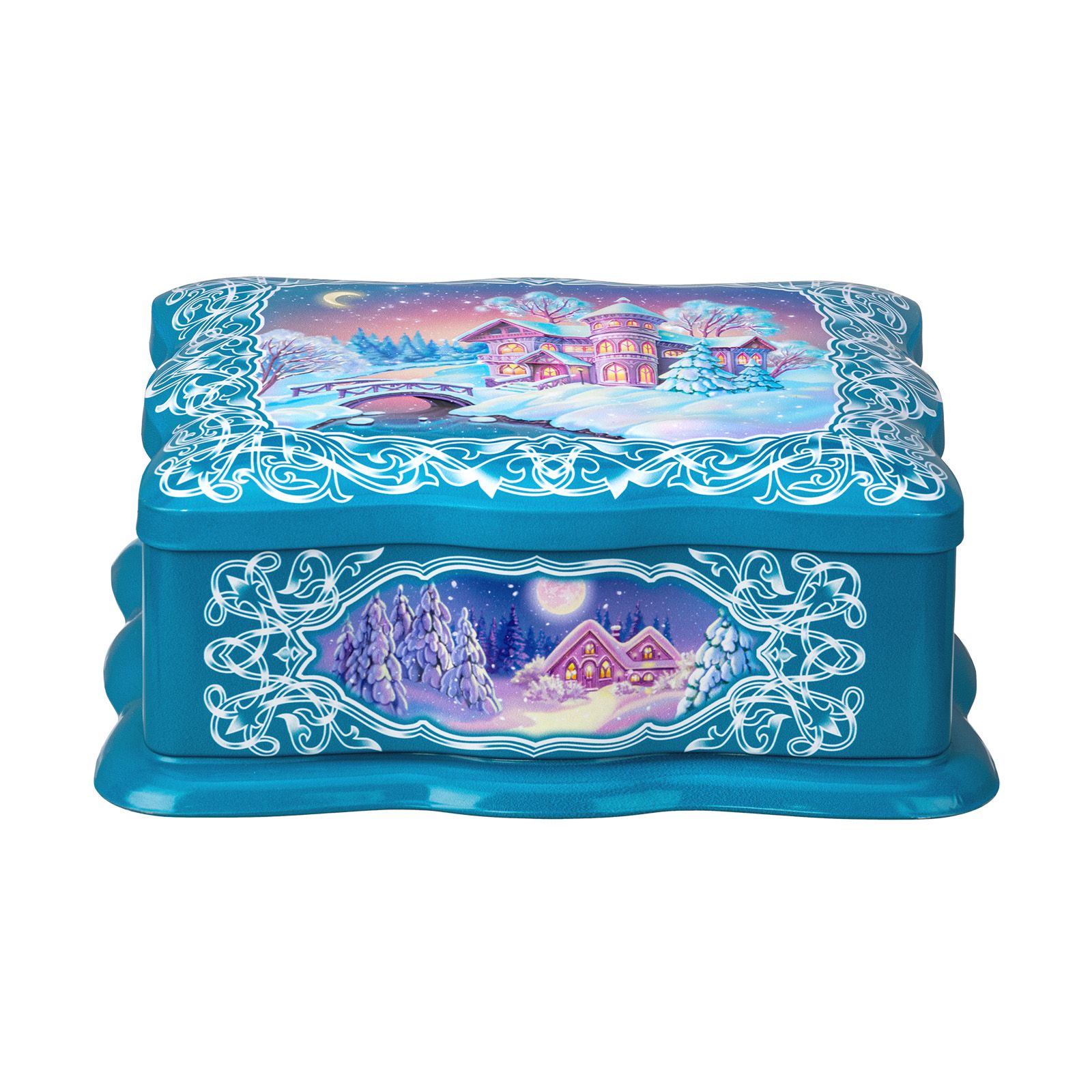 Если вам нужен премиальный подарок в хорошей упаковке с дорогим составом, то предлагаем обратить внимание на вариант «Зимняя симфония». Упаковка сделана из металла в форме шкатулки, основная цветовая гамма синяя. На рисунке изображен домик на фоне зимнего пейзажа. На боковых гранях изображен домик в зимнем лесу. Кондитерский набор расположен внутри под плотной крышкой. Вес подарка составляет 1000 граммов. Каждый член семьи найдет в нем свое любимое лакомство. Шоколадные конфеты с начинками пралине, суфле, нуга, желе и другие; нежные десерты, батончики, печенье – здесь есть все для новогоднего чаепития. Подарок рекомендован для дарения детям старшего возраста, партнерам по бизнесу, коллегам, мамам и бабушкам.