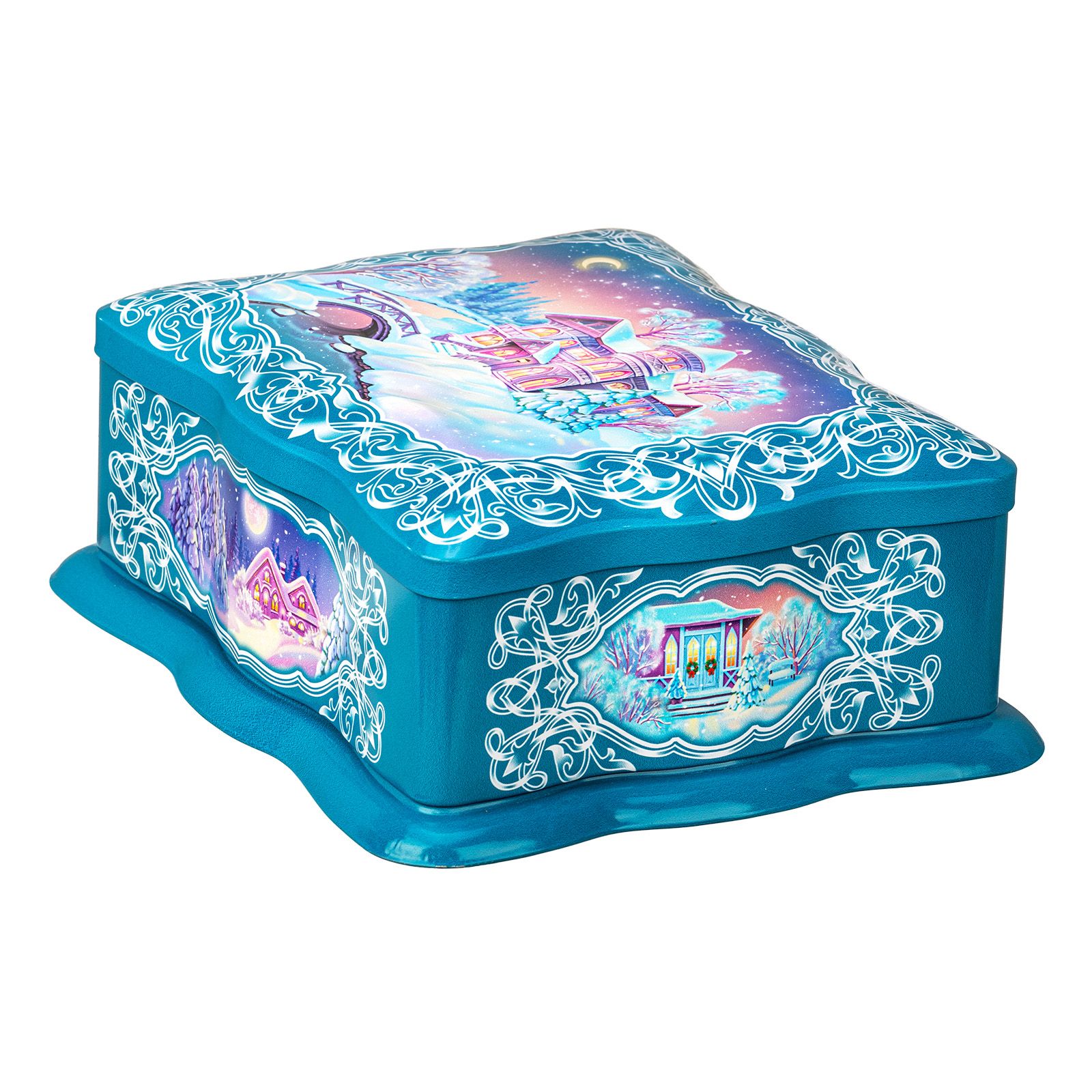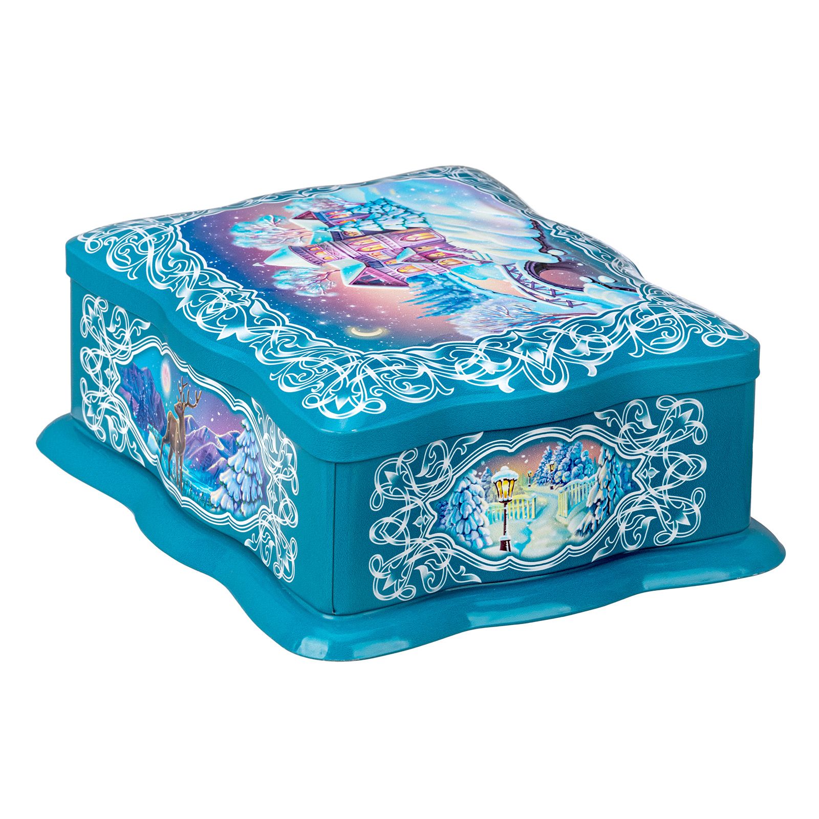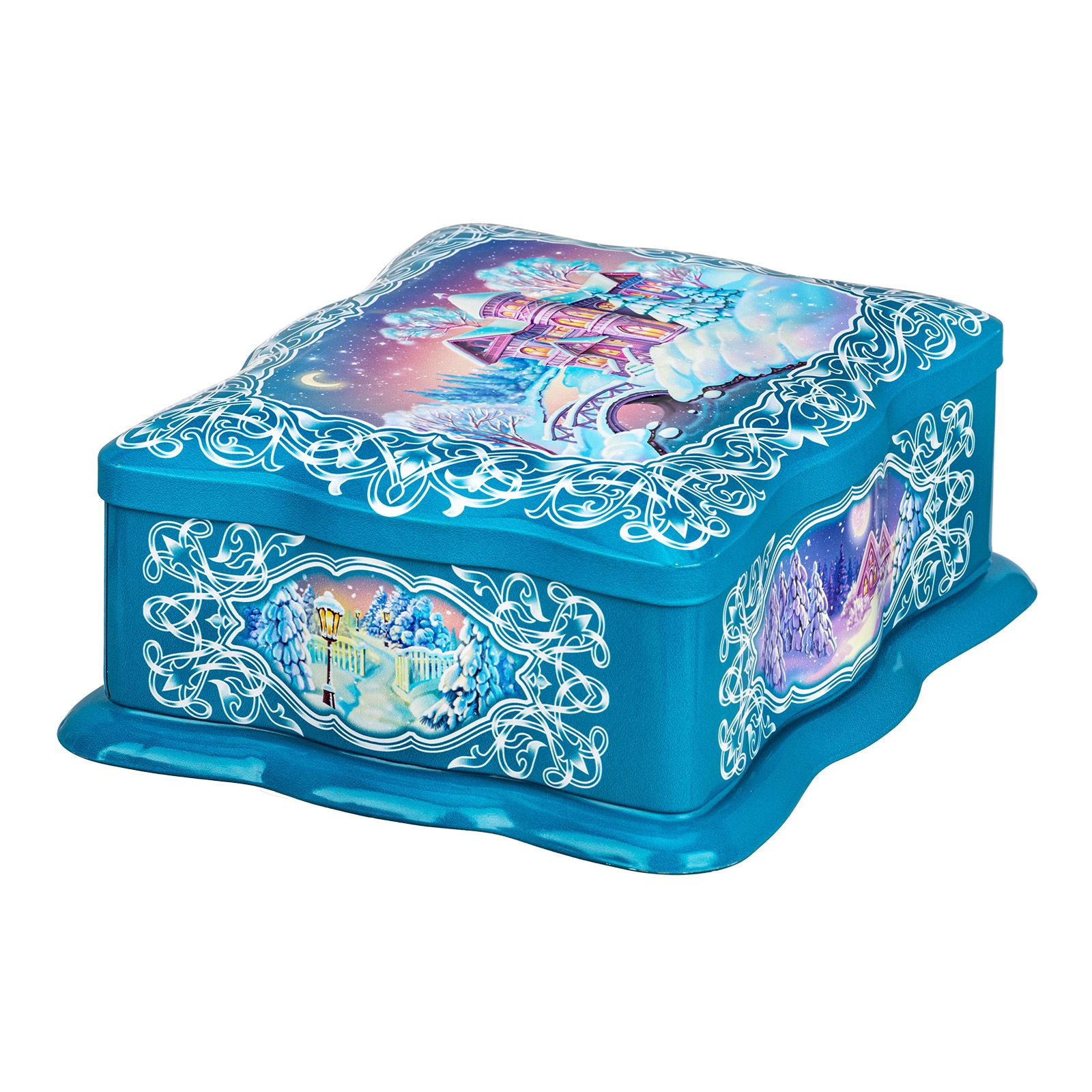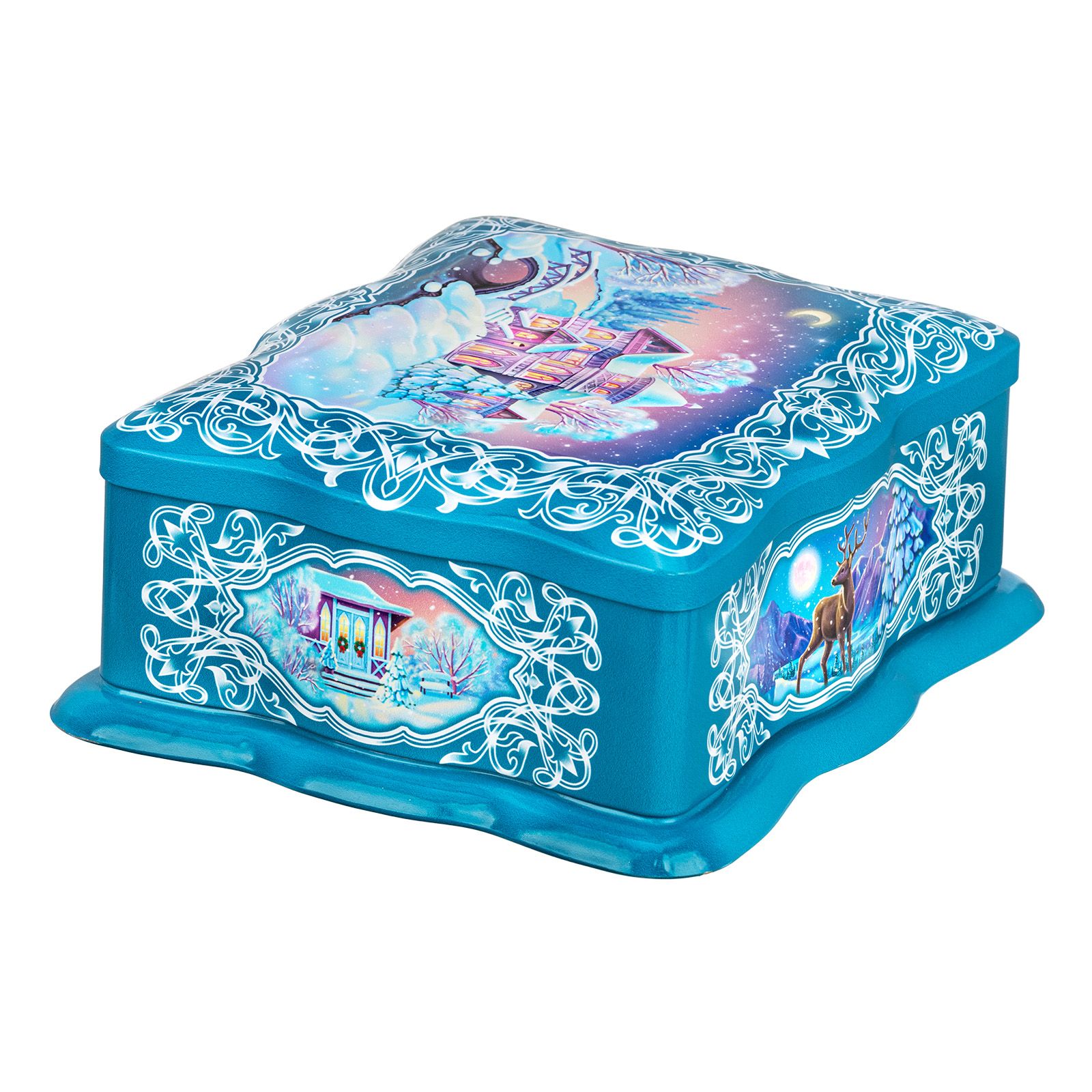 Если вам нужен премиальный подарок в хорошей упаковке с дорогим составом, то предлагаем обратить внимание на вариант «Зимняя симфония». Упаковка сделана из металла в форме шкатулки, основная цветовая гамма синяя. На рисунке изображен домик на фоне зимнего пейзажа. На боковых гранях изображен домик в зимнем лесу. Кондитерский набор расположен внутри под плотной крышкой. Вес подарка составляет 1000 граммов. Каждый член семьи найдет в нем свое любимое лакомство. Шоколадные конфеты с начинками пралине, суфле, нуга, желе и другие; нежные десерты, батончики, печенье – здесь есть все для новогоднего чаепития. Подарок рекомендован для дарения детям старшего возраста, партнерам по бизнесу, коллегам, мамам и бабушкам.